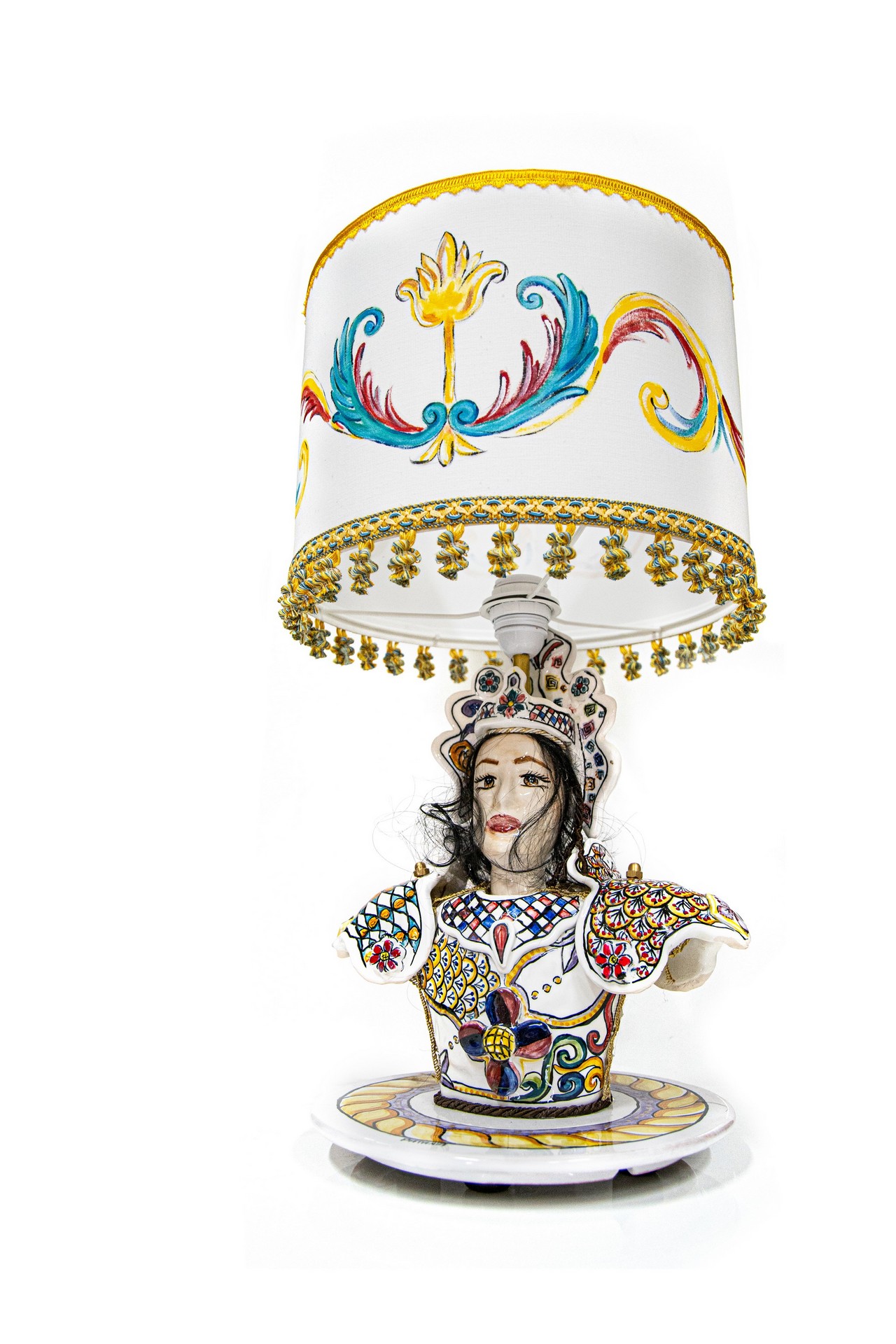 Mezzo busto di pupo siciliano, personaggio Angelica, realizzato in ceramica struttura interna in legno di faggio e paralume decorato a mano.