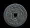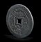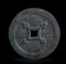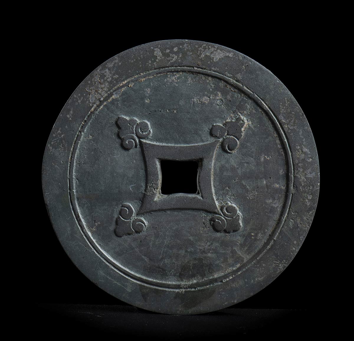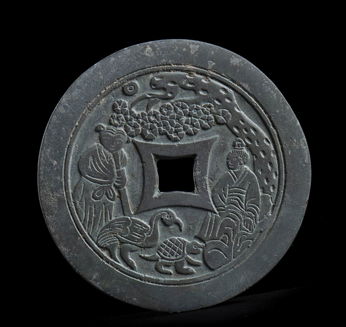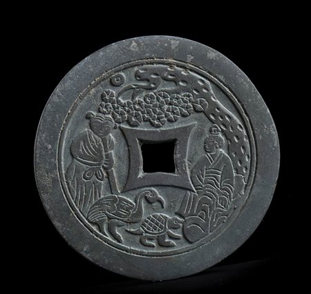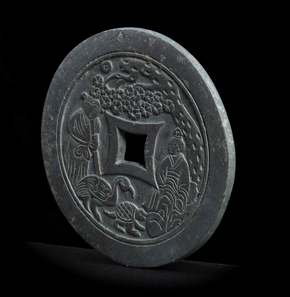 A forma di moneta con foro al centro, presenta su un lato una decorazione a rilievo con due figure, un albero, una gru e una tartaruga.