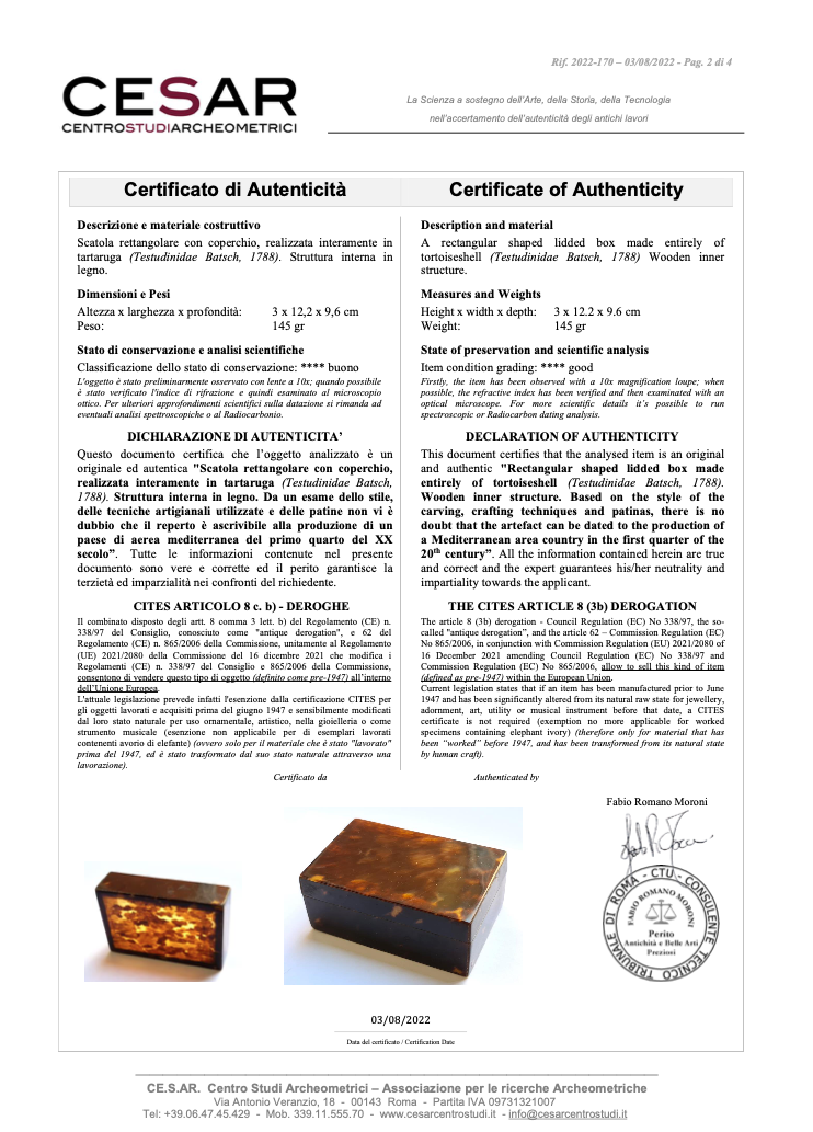 L'attuale legislazione prevede infatti l'esenzione dalla certificazione CITES per gli oggetti lavorati e acquisiti prima del giugno 1947 e sensibilmente modificati dal loro stato naturale per uso ornamentale, artistico, nella gioielleria o come strumento musicale.