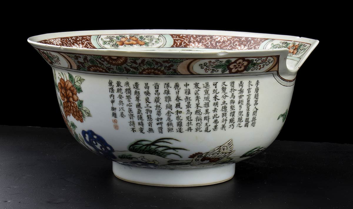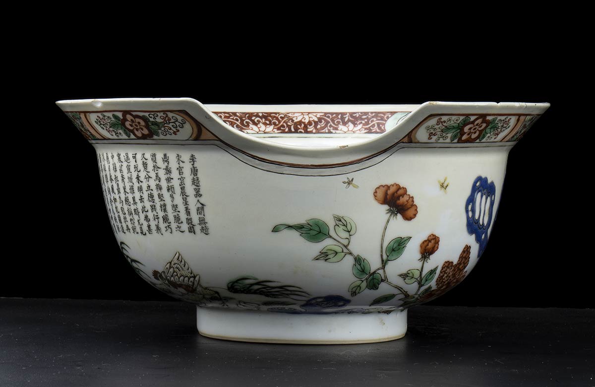 La decorazione a smalti policromi mostra sull’esterno figure nel paesaggio tra rocce, fiori e insetti, su un lato una lunga iscrizione, foglia di artemisia al centro della base.
