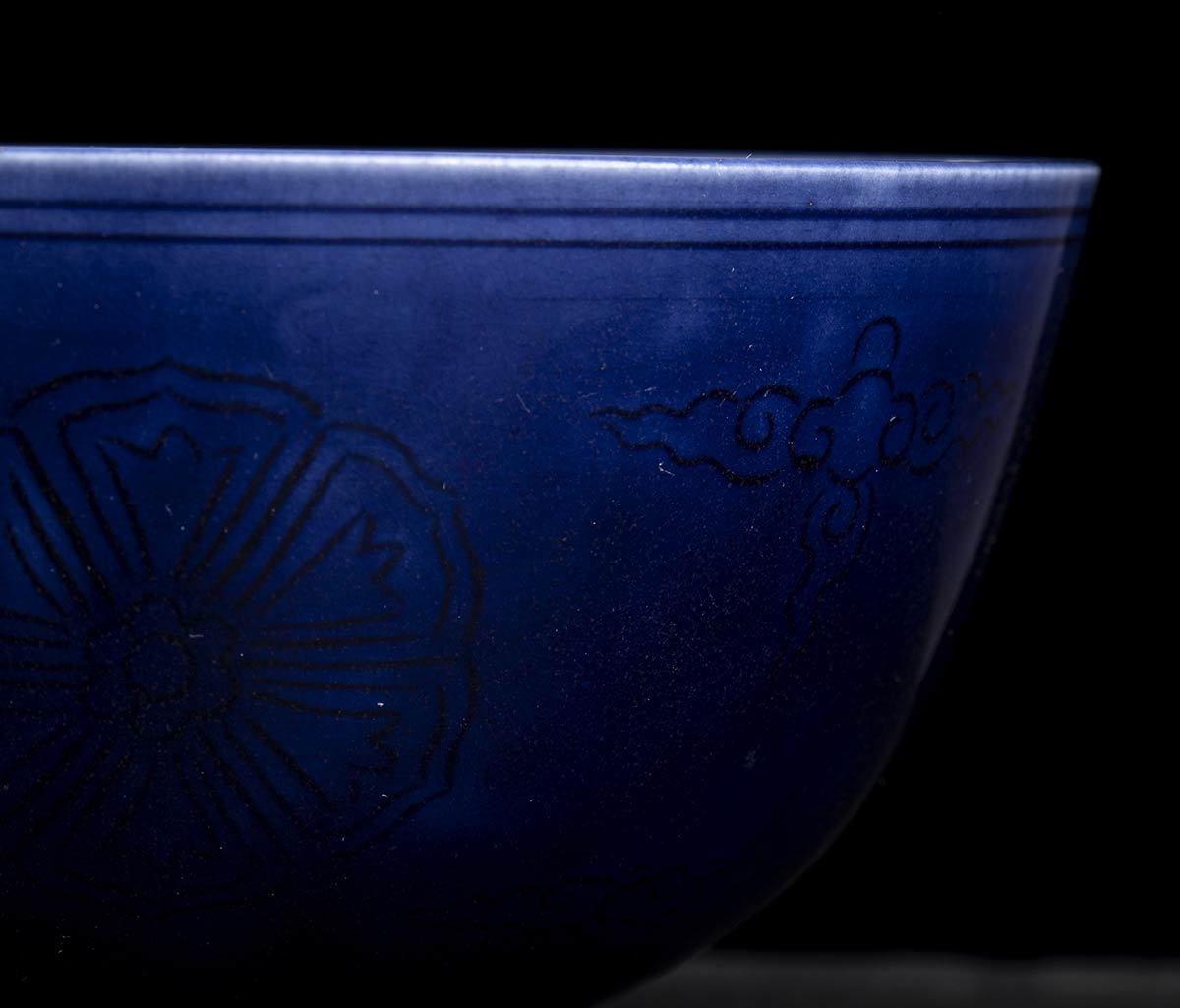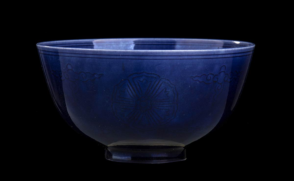 CIOTOLA IN PORCELLANA CON INVETRIATURA MELANZANA E DECORO INCISO