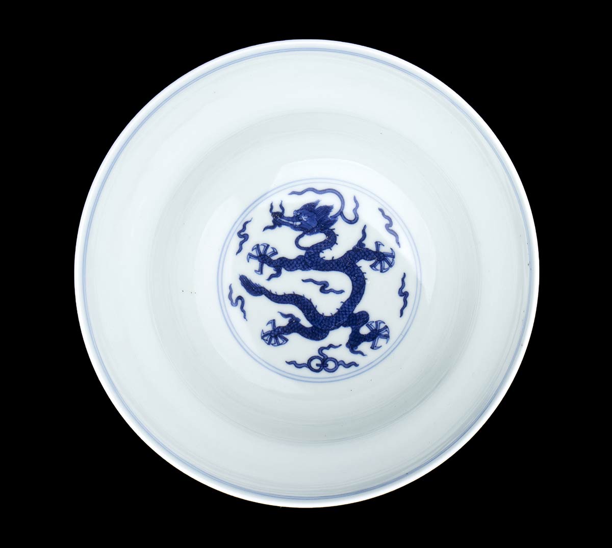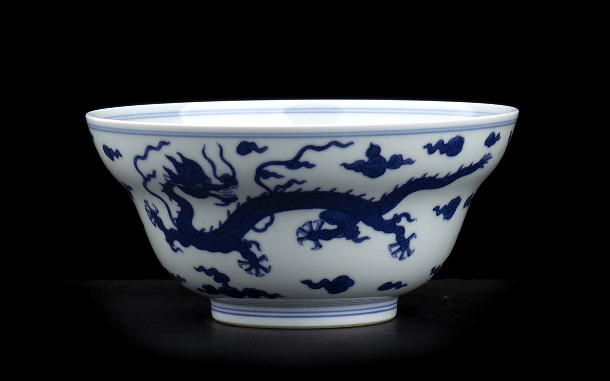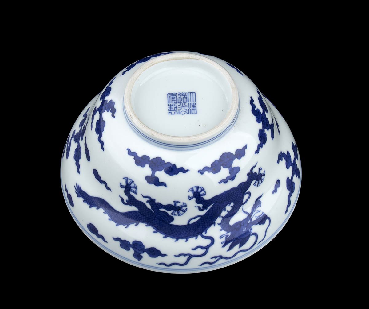 Decorata al centro del fondo sull’esterno con draghi di stile Ming in volo tra nuvole e dardi.