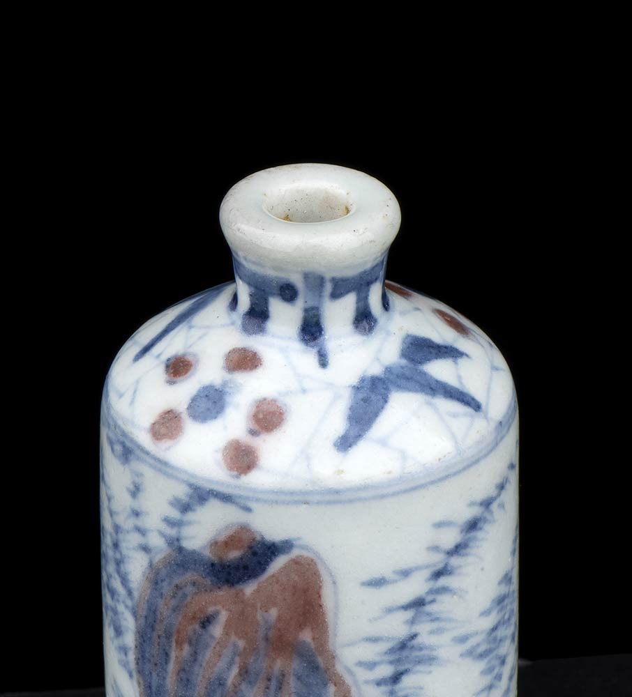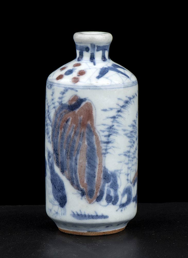 SNUFF BOTTLE IN PORCELLANA CON DECORO A SMALTI BLU DI COBALTO E ROSSO DI RAME