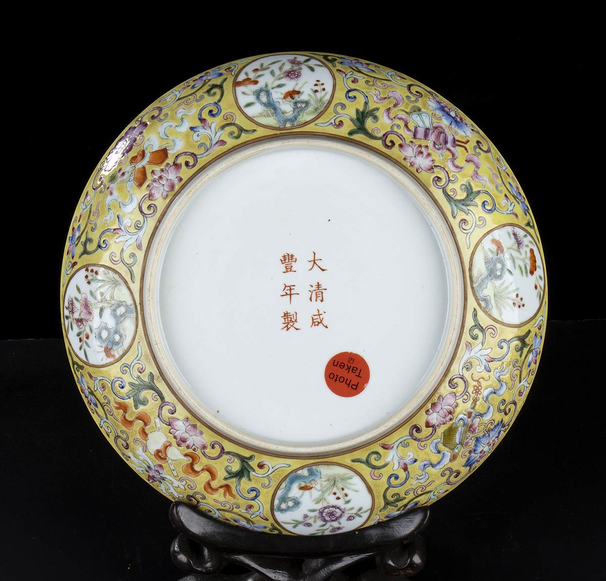 L’interno con il carattere shou (“longevità”) e pipistrelli, l’esterno della parete con medaglioni circolari con composizioni floreali a riserva su fondo giallo con arabeschi di fiori di loto e oggetti beneaugurali.