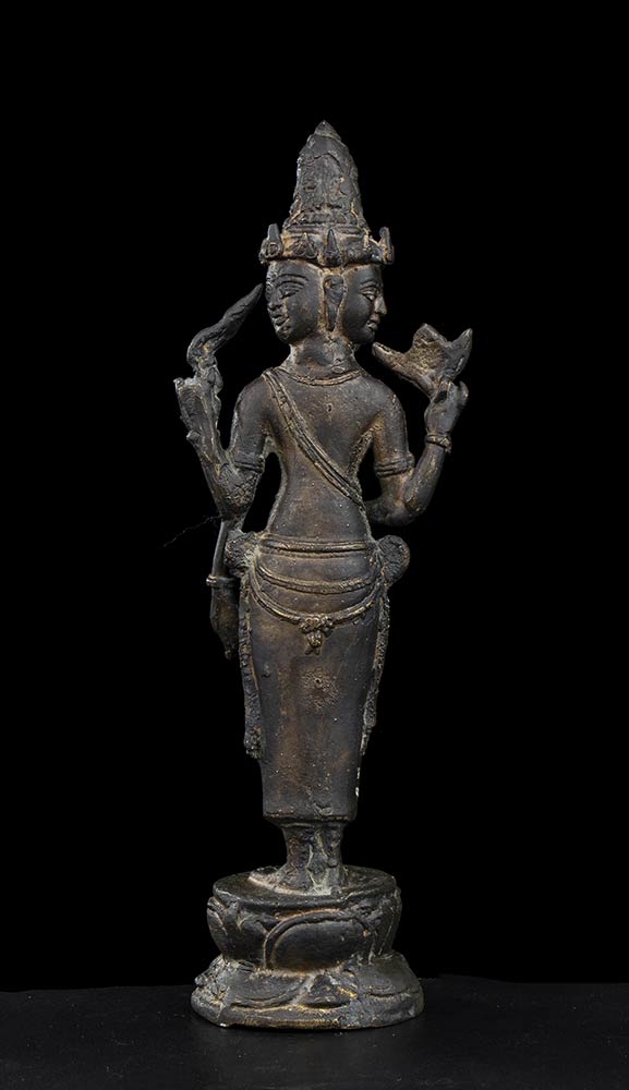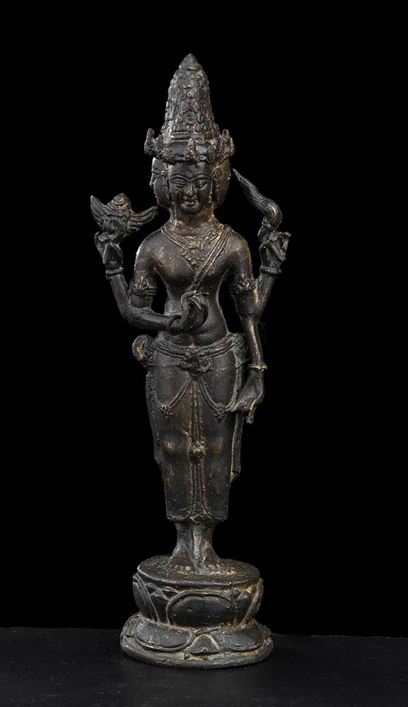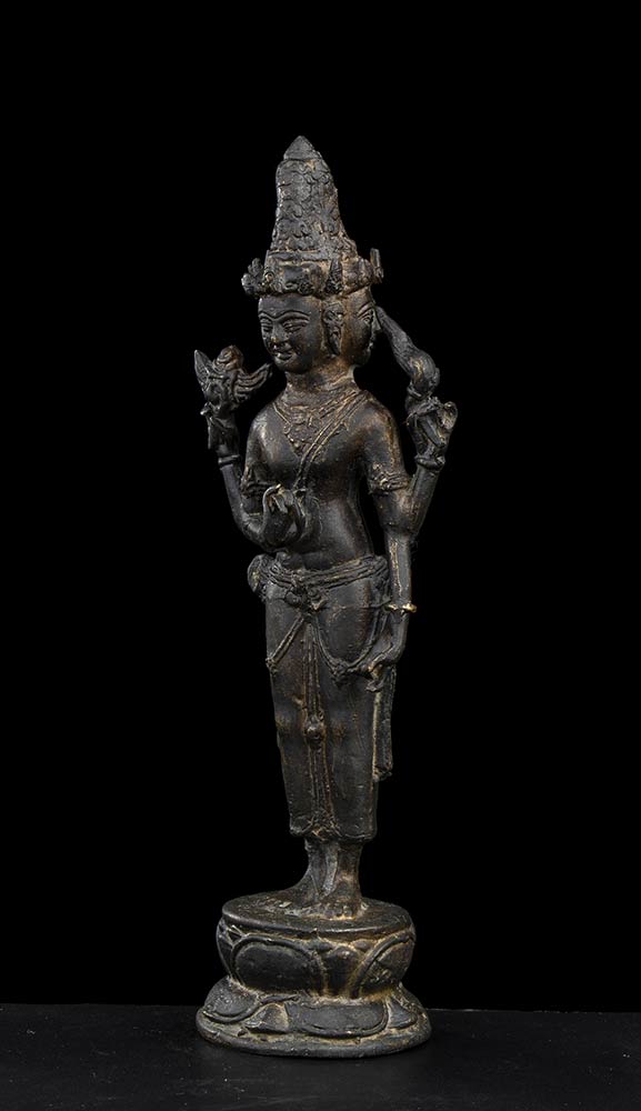 Raffigurata stante su base a doppio fiore di loto, presenta quattro braccia con attributi e tre volti, il capo sormontato da alta protuberanza.
