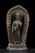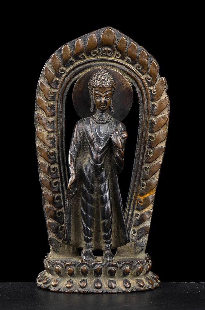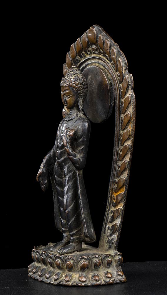 La divinità raffigurata stante su base a doppio fiore di loto con ampio nimbo fiammeggiante.
