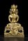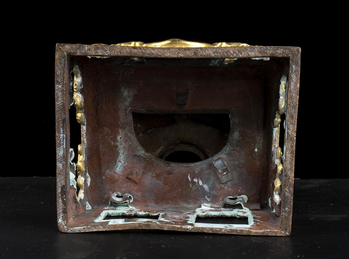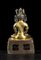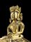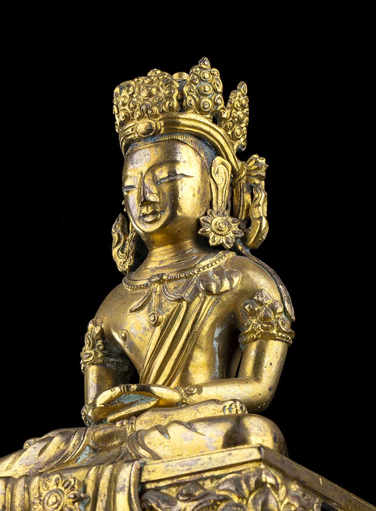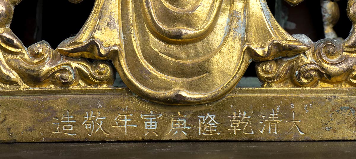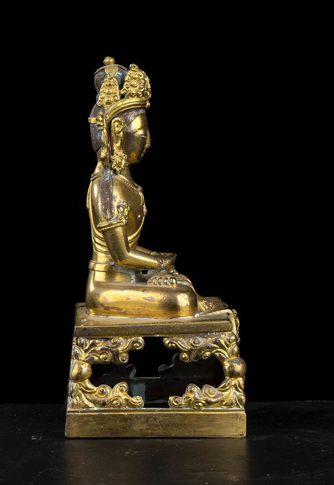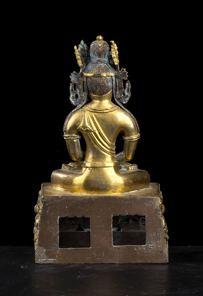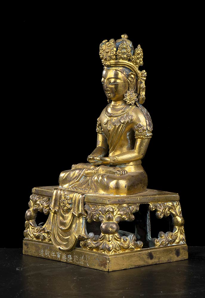 La divinità seduta con le gambe incrociate in posizione dhyanasana su plinto a sezione rettangolare, le mani l’una sull’altra a palmi aperti in grembo nel dhyanamudra, l’ampio abito che lascia scoperta parte del busto con lungo strascico sul davanti, sul capo un’esuberante corona a pinnacoli, iscrizione 大清乾隆庚寅年敬造 (Da Qing Qianlong gengyin nian jing zao, “realizzata nell’anno ciclico gengyin durante il regno di Qianlong dei grandi Qing”) sul lato inferiore del basamento.