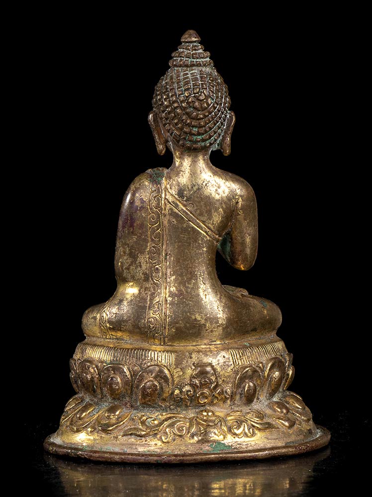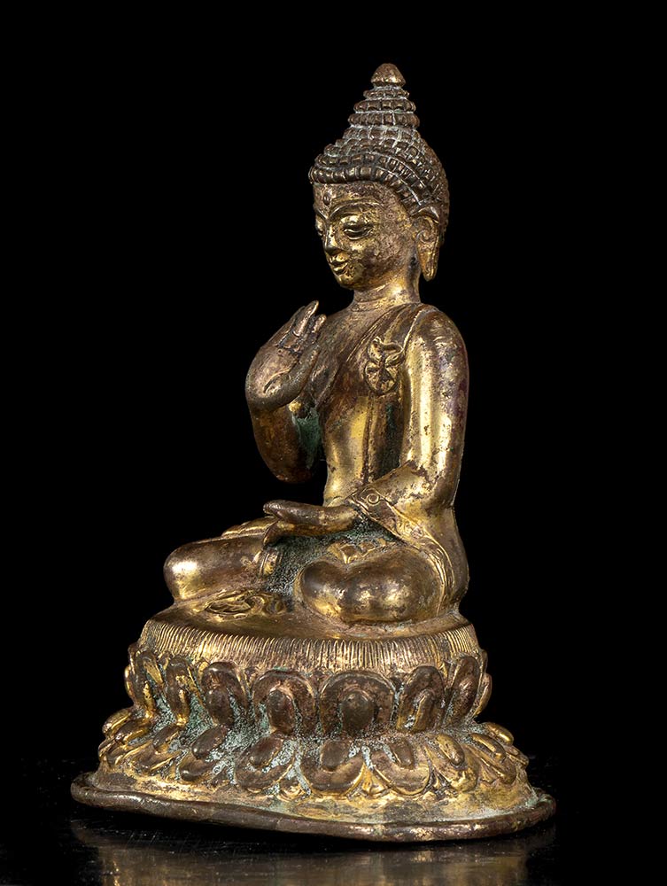La divinità raffigurata seduta a gambe incrociate in posizione padmasana su base a doppio fiore di loto, la mano destra con il palmo aperto nel gesto della rassicurazione abhayamudra, quella sinistra posata in grembo, vestito di ampio abito che lascia scoperta la spalla destra.