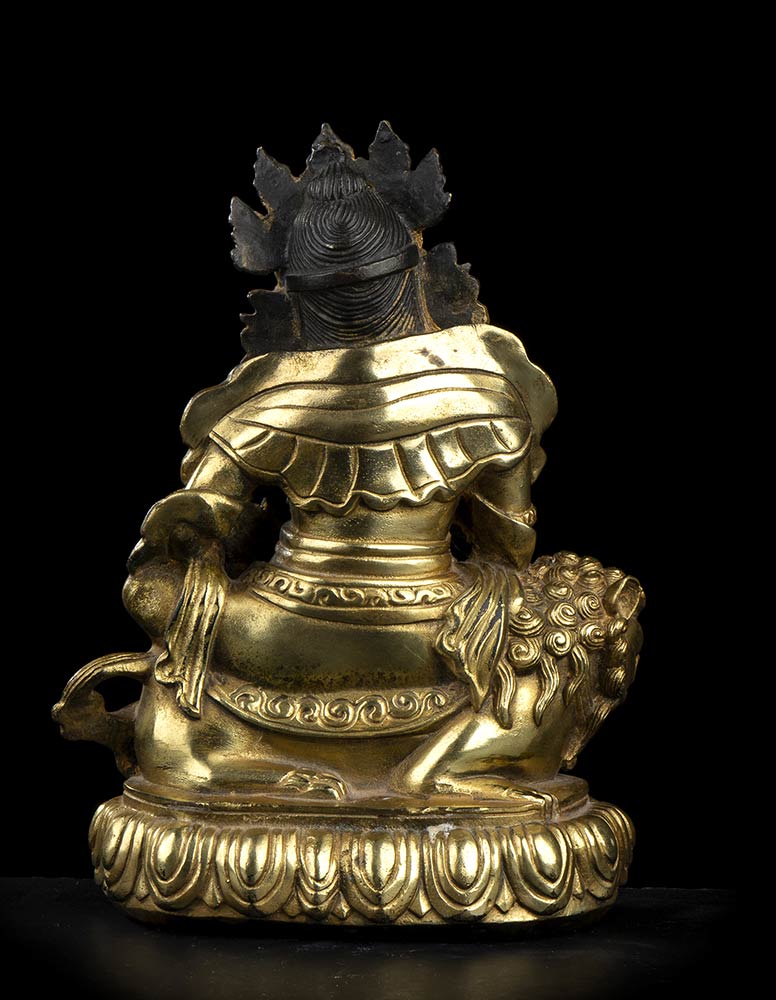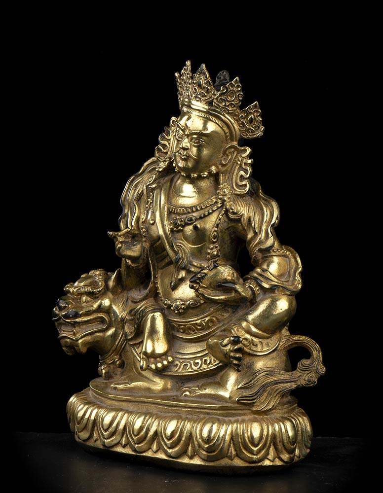 La divinità seduta in posizione lalitasana sul dorso di un leone a sua volta posato su base a fiore di loto, nella mano sinistra una conchiglia e in quella destra una mangusta, attributi tipici del dio della ricchezza, sul capo una corona a cinque pinnacoli, il volto austero con baffi e barba.