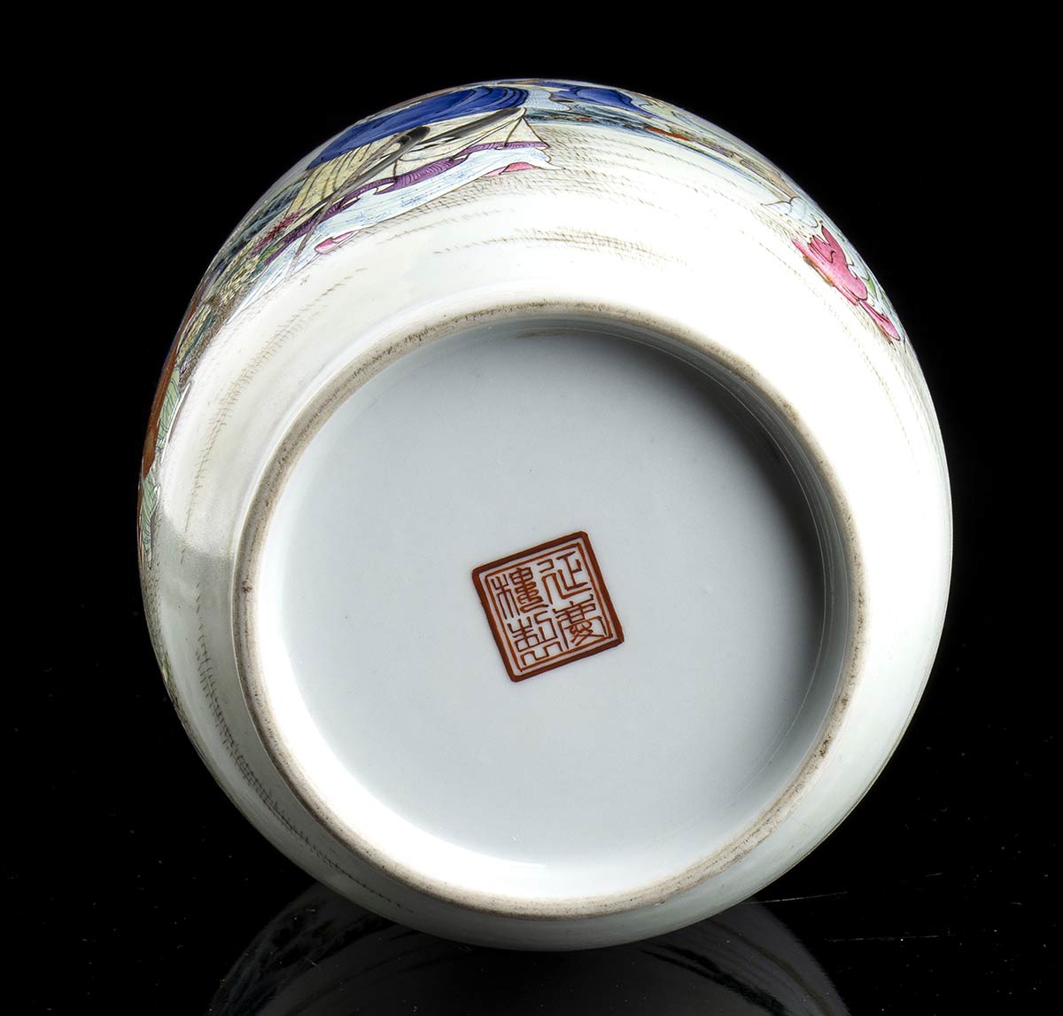 Sul corpo una scena con un saggio e attendenti nel paesaggio, marchio al centro della base.