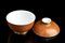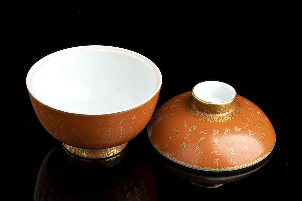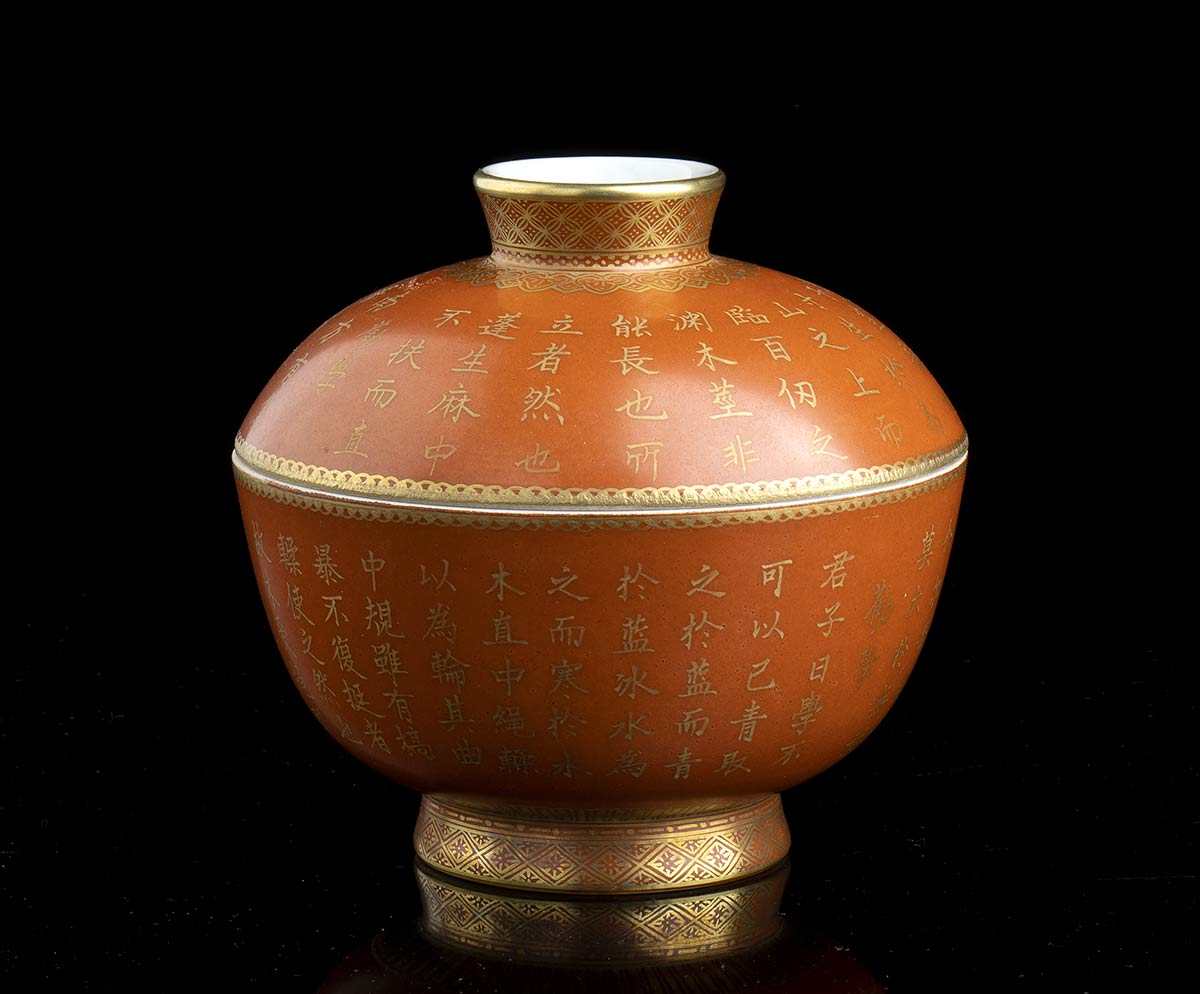 CIOTOLA CON COPERCHIO IN PORCELLANA CON INVETRIATURA ROSSO CORALLO E DECORO A ORO