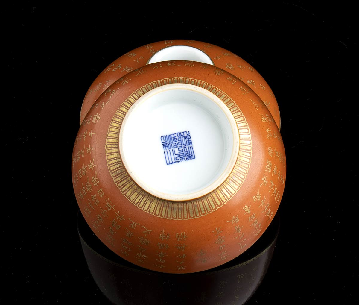 La decorazione consiste di una lunga iscrizione, marchio apocrifo di Qianlong al centro della base.
