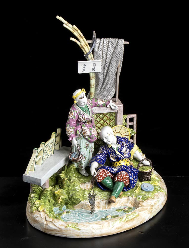 Il gruppo descrive una scena nei pressi di un laghetto con una coppia di giovani figure, lui seduto intento a pescare, lei in piedi al suo fianco con un cesto con pesci, l’ambientazione arricchita di un ponticello e una staccionata da cui pende un tessuto e un cartiglio con l’iscrizione 彩潤堂製 (Cairun tai zhi, “Realizzato per la Sala arricchita di brillantezza”).