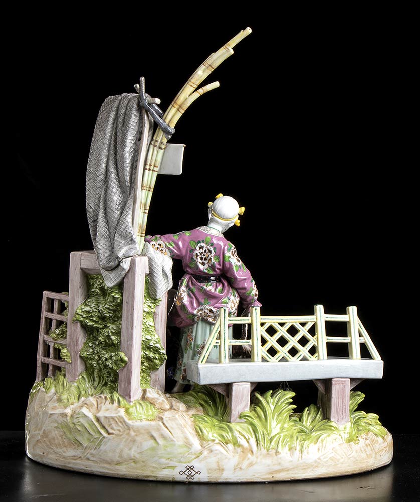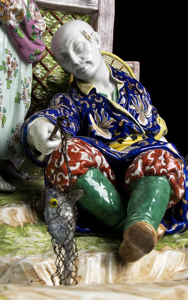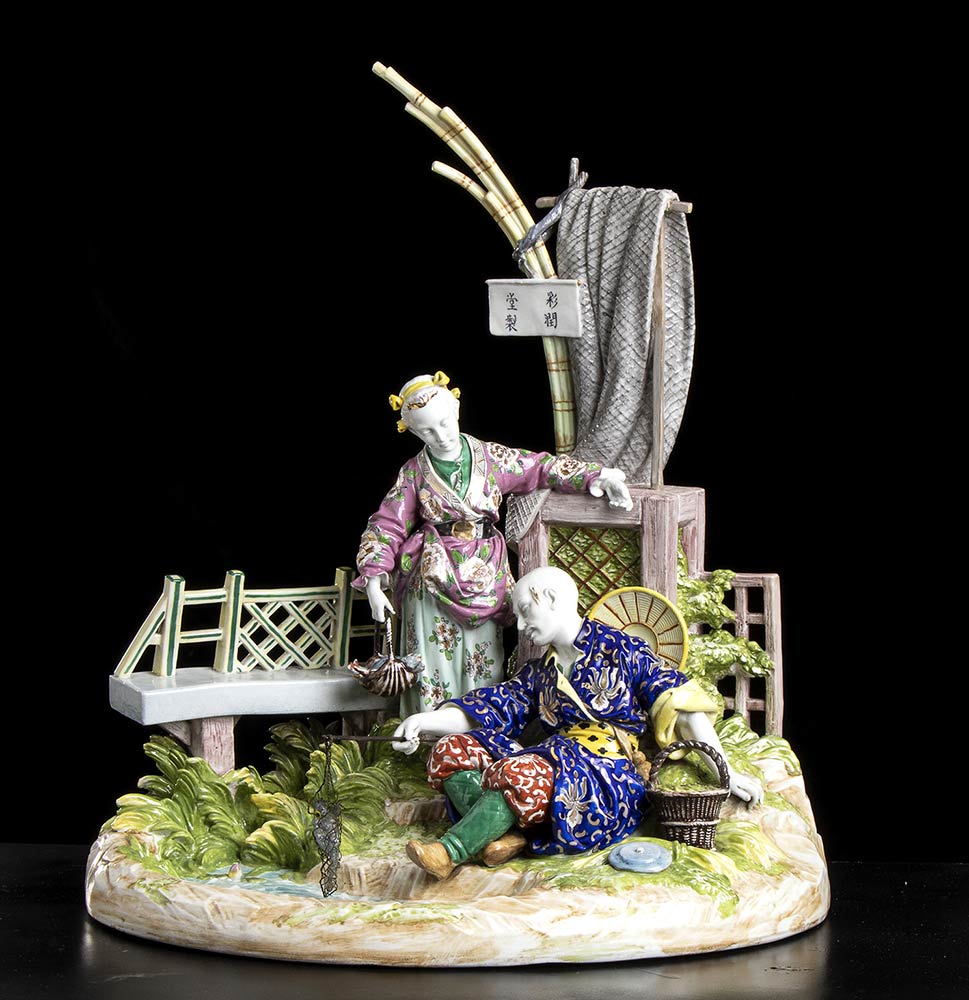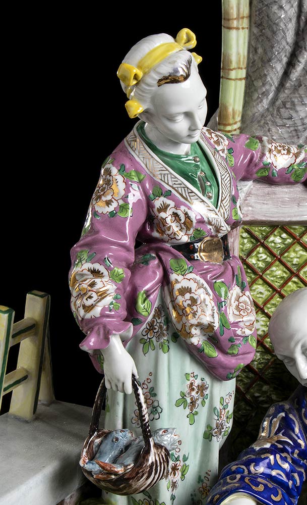 Questa scultura in porcellana riprende piuttosto fedelmente una composizione di Francois Boucher riprodotta a stampa da Gabriel Huquier intorno alla metà del XVIII e inserita nella nota serie Scenes de la vie chinois. Un esemplare di questa stampa si trova nel Metropolitan Museum di New York (inv. 53.600.1019(3)).