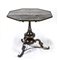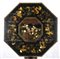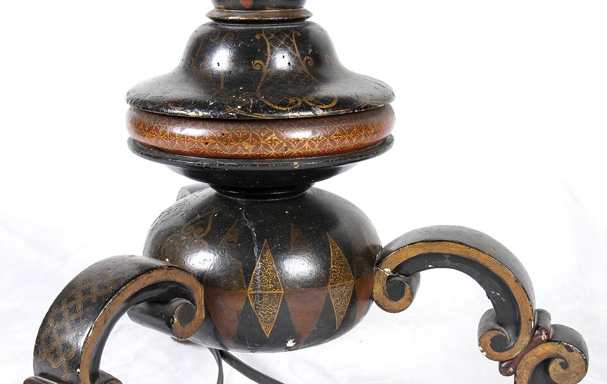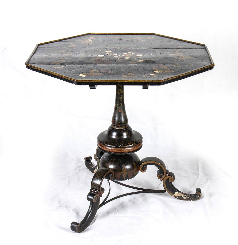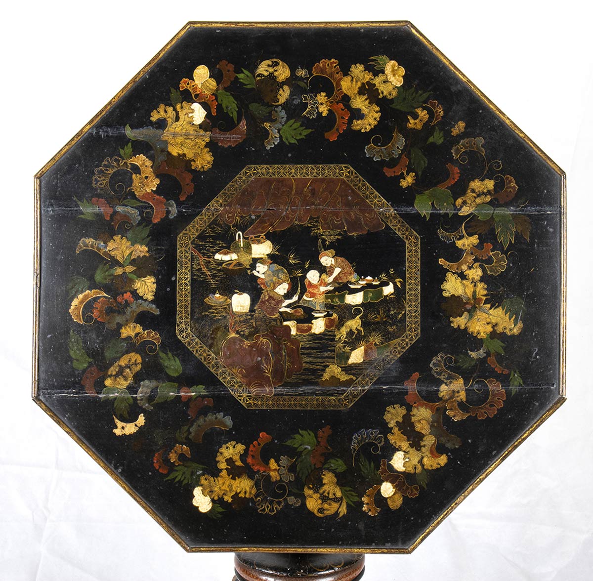 Il tavolo ha piano ottagonale ribaltabile sostenuto da fusto a colonna con tre piedi ricurvi, l’intera superficie esterna laccata a fondo nero, lumeggiata e dipinta in policromia con motivi di ispirazione estremo orientale, il piano con una esuberante cornice di foglie barocche a racchiudere una riserva ottagonale al cui interno si svolge una elegante decorazione di personaggi ‘alla cinese’ alle prese con attività quotidiane, la scena ambientata in uno scorcio di paesaggio.