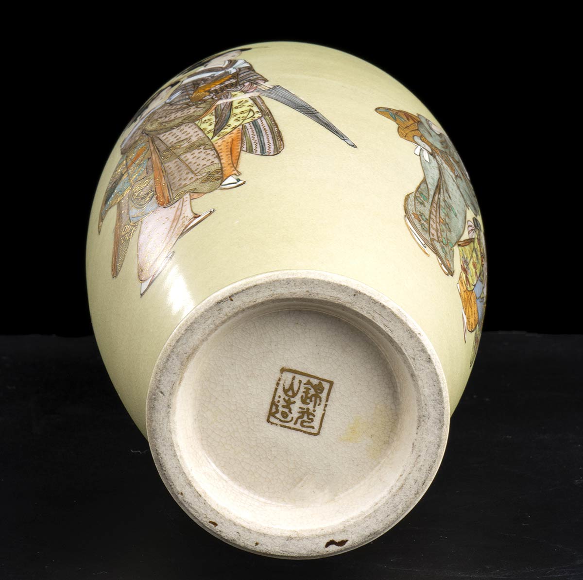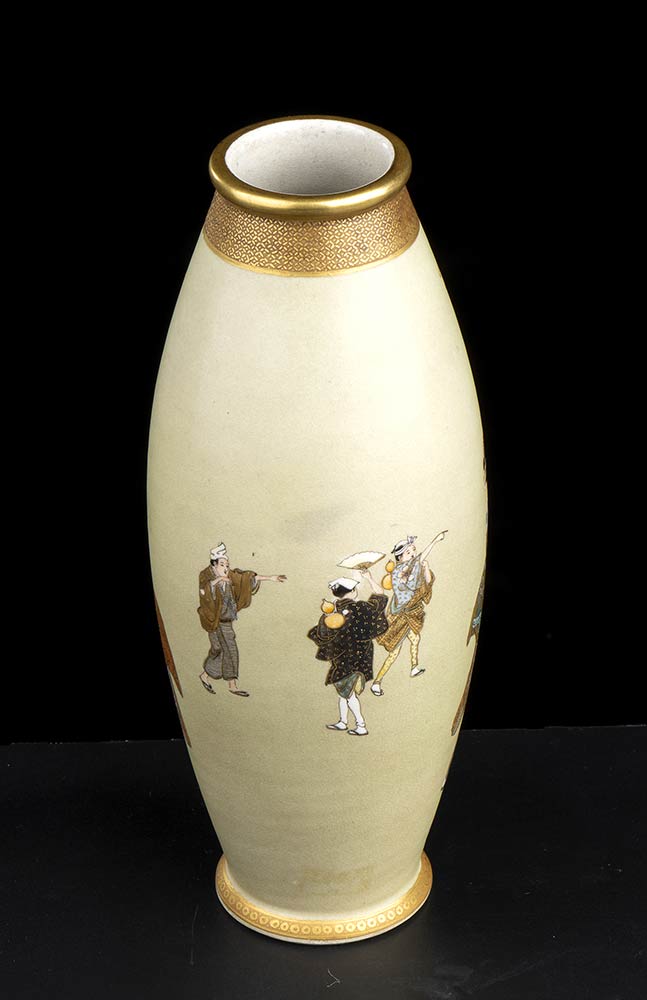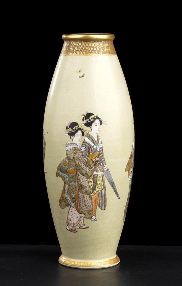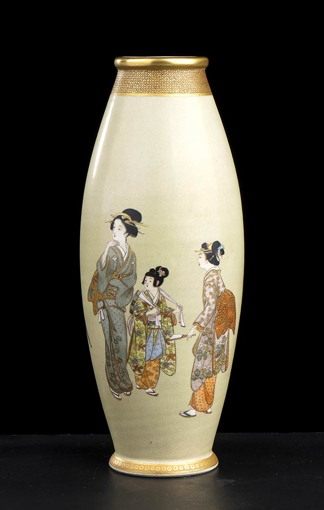 A sezione circolare con ampiezza massima del diametro nei pressi della zona centrale, raffigura sul corpo tre eleganti cortigiane con una giovane attendente e tre figure maschili, l’orlo della bocca sottolineato da fascia a oro con motivo geometrico a rilievo, marchio 錦光山造 (Kinkozan tsukuru, “Realizzato da Kinkozan”) al centro della base.