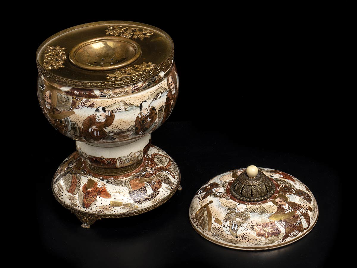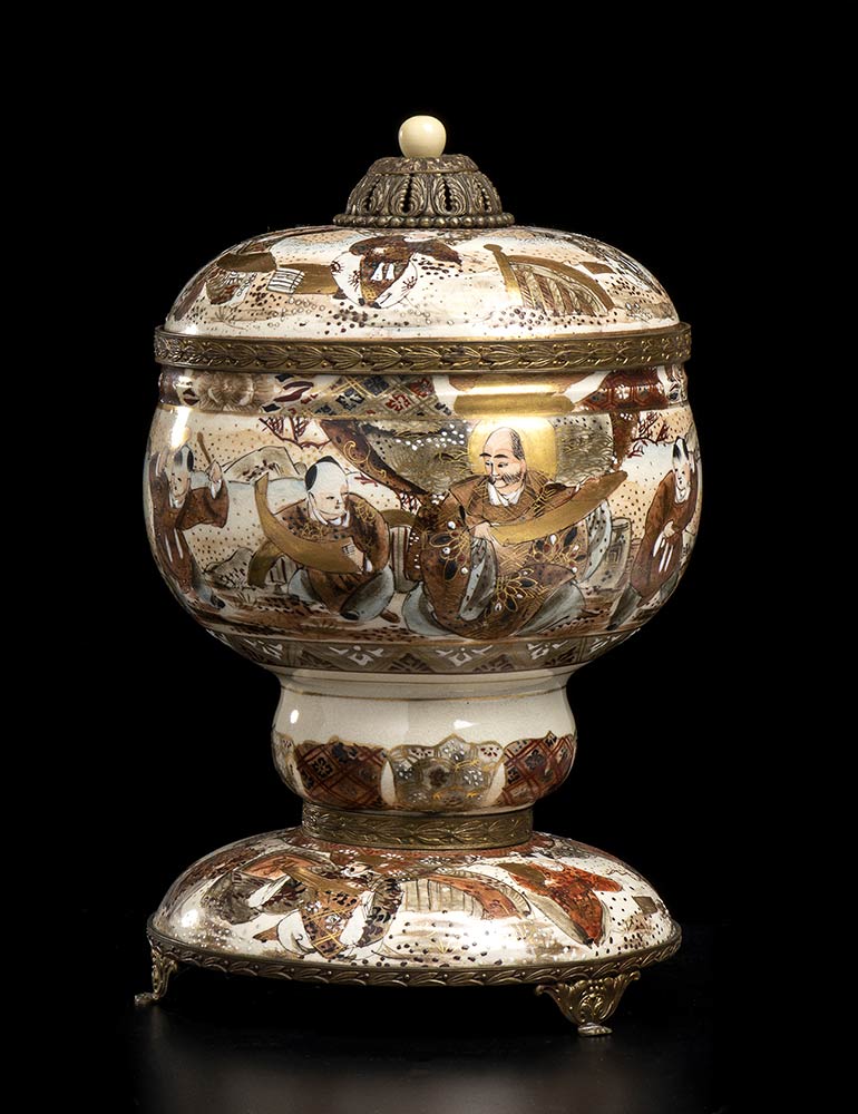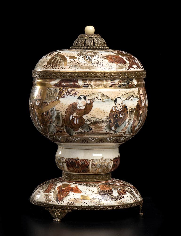 COPPA A STELO CON COPERCHIO IN CERAMICA SATSUMA E MONTATURA IN BRONZO