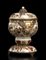 A sezione circolare, presenta sull'esterno una decorazione in policromia e oro di figure nel paesaggio, la montatura consiste di una profilatura lungo la base, di una piastra sulla bocca con rilievo di tre coppie di chimere con cesto di fiori, della presa del coperchio ornata a rilievo di foglie.