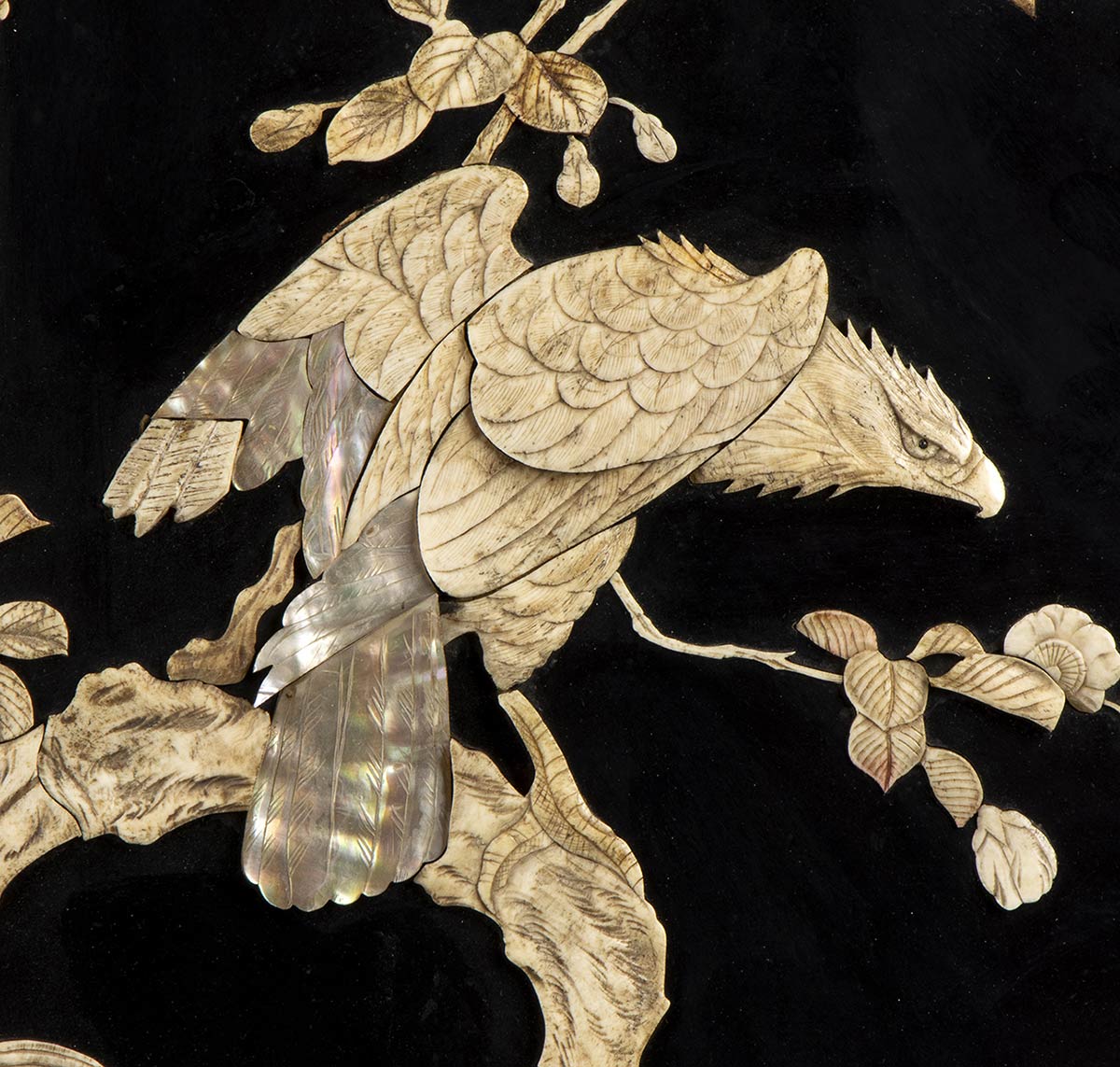 PANNELLO IN LEGNO LACCATO CON INTARSI IN OSSO E MADREPERLA