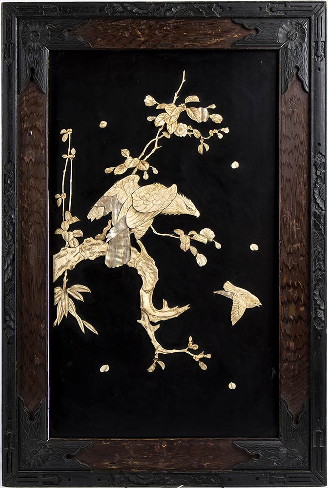 Lot 231 | PANNELLO IN LEGNO LACCATO CON INTARSI IN OSSO E MADREPERLA