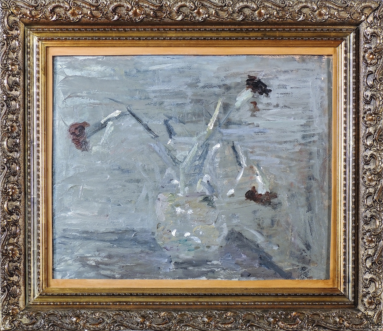 MARIO MARCUCCI (1910-1992) Tre garofani olio su cartone, firmato e datato '66, in cornice cm 40x49 Al verso reca timbro e cartiglio "100 Opere di Mario Marcucci, Galleria d'Arte Moderna Fratelli Falsetti, Prato".