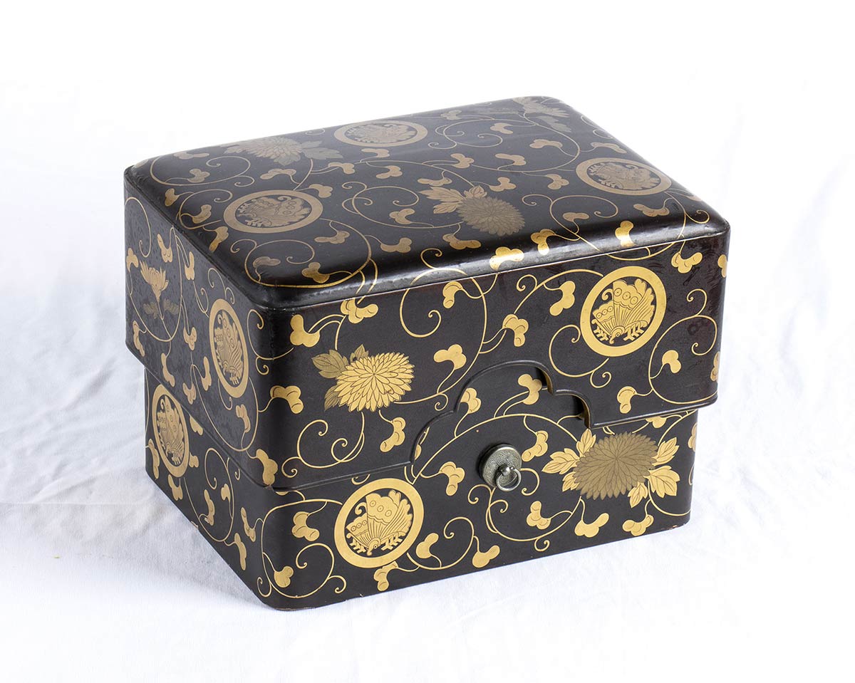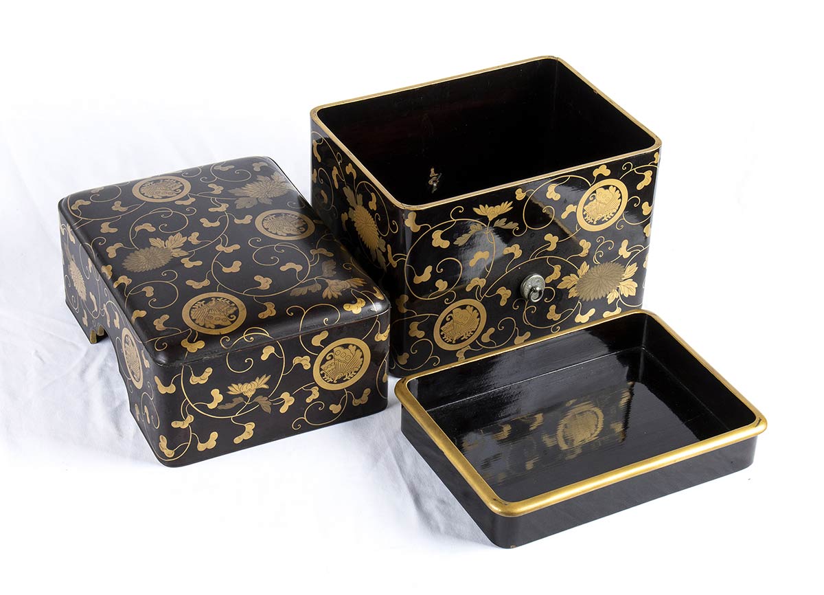 La decorazione in maki-e con sinuosi girali fitomorfi tra cui si inseriscono emblemi araldici (mon) circolari con farfalla.