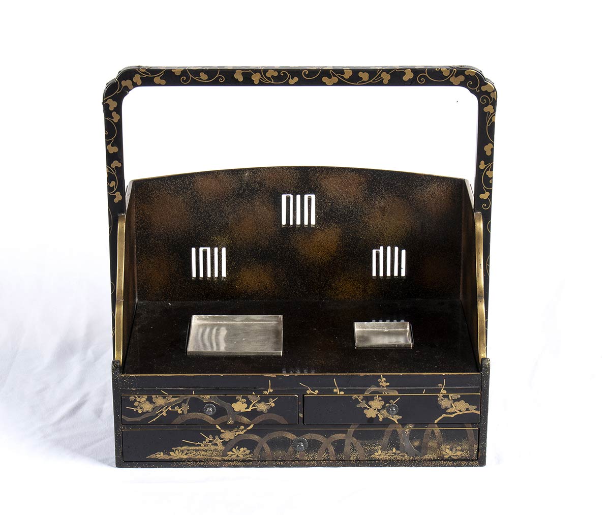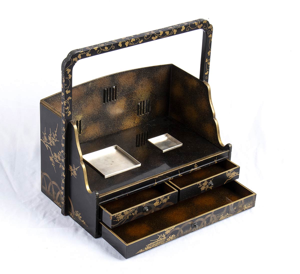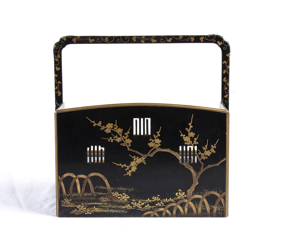 Finemente decorato in maki-e con motivi floreali, ha tre cassetti sul davanti e un ampio manico, manca di braciere e posacenere, sostituiti da vassoietti in argento.