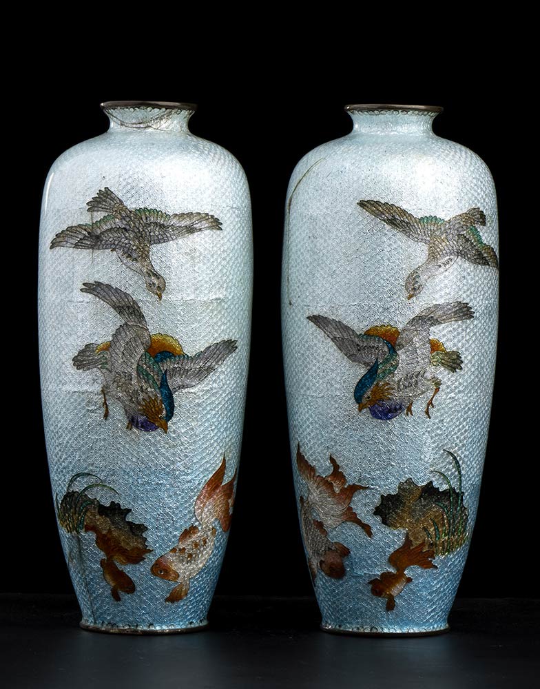COPPIA DI VASI IN METALLO CON DECORO A SMALTI CLOISONNÉ DI TIPO GINBARI