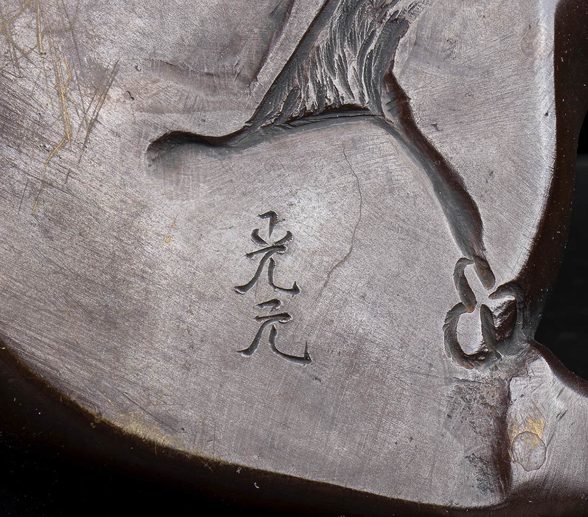 Gli occhi sono intarsi di corno, firmato 光元 (Mitsumoto) sul lato inferiore.