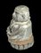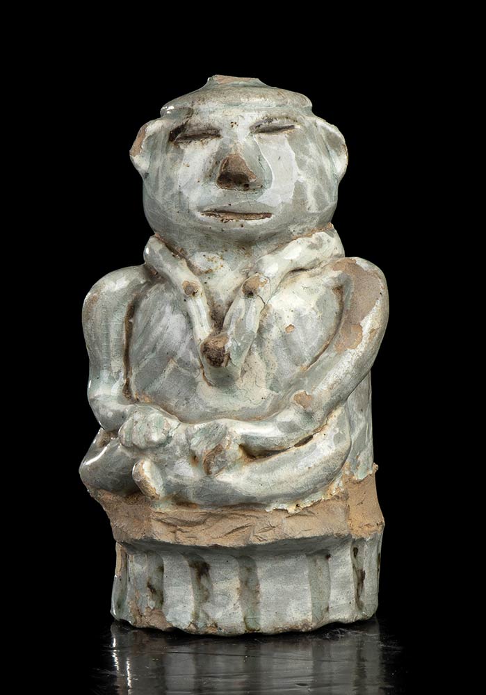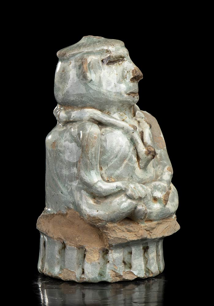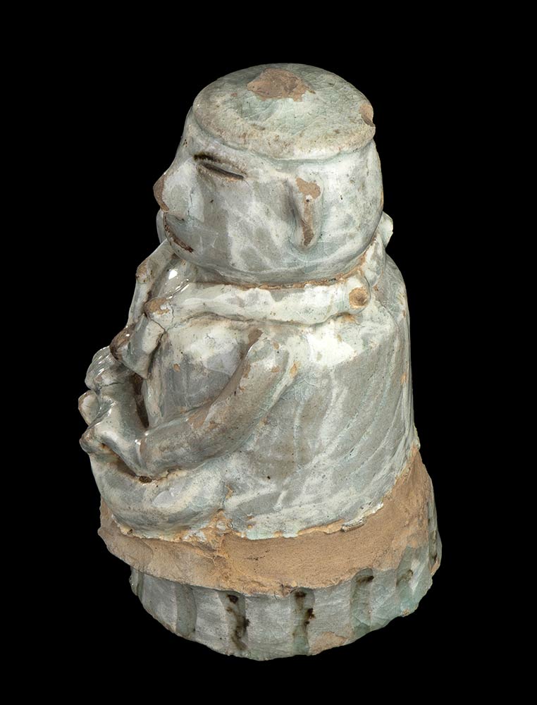 La figura seduta a gambe incrociate su basamento a sezione circolare con dentellatura, la superficie esterna rivestita di invetriatura dai riflessi azzurrati.