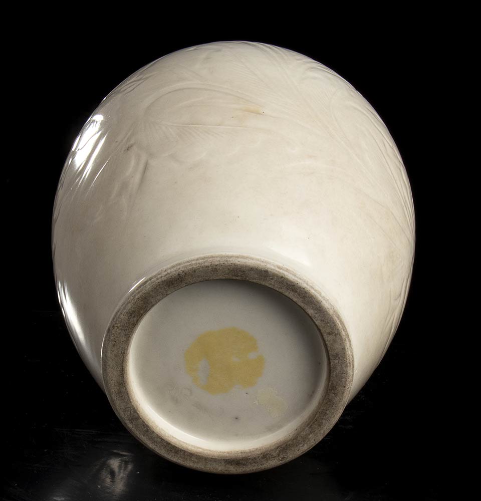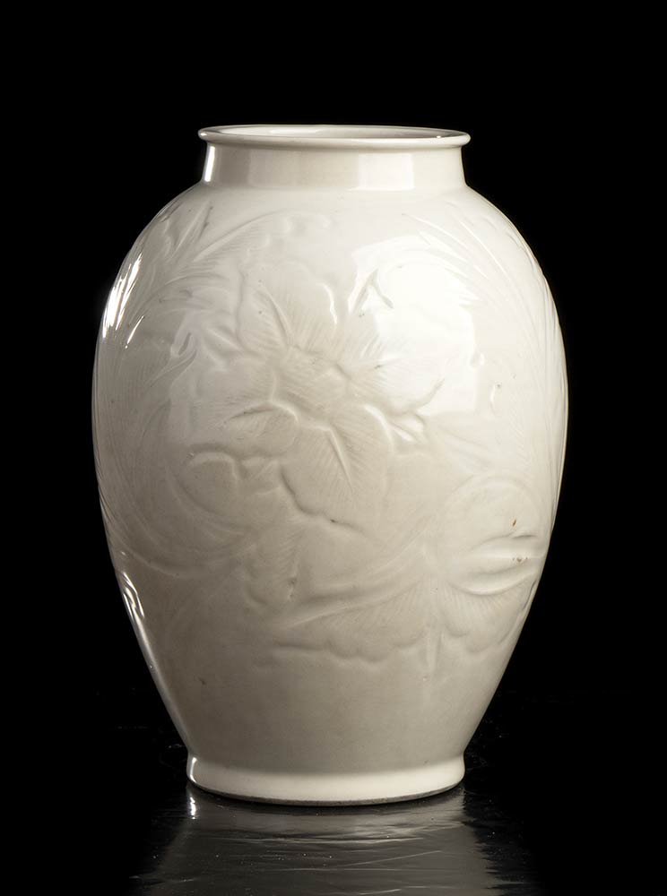 Il vaso ha corpo ovoidale sormontato da breve ma robusto collo cilindrico con bocca sottolineata da bordino, la decorazione incisa e a rilievo consiste di motivi floreali.
