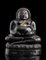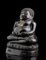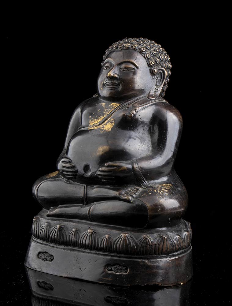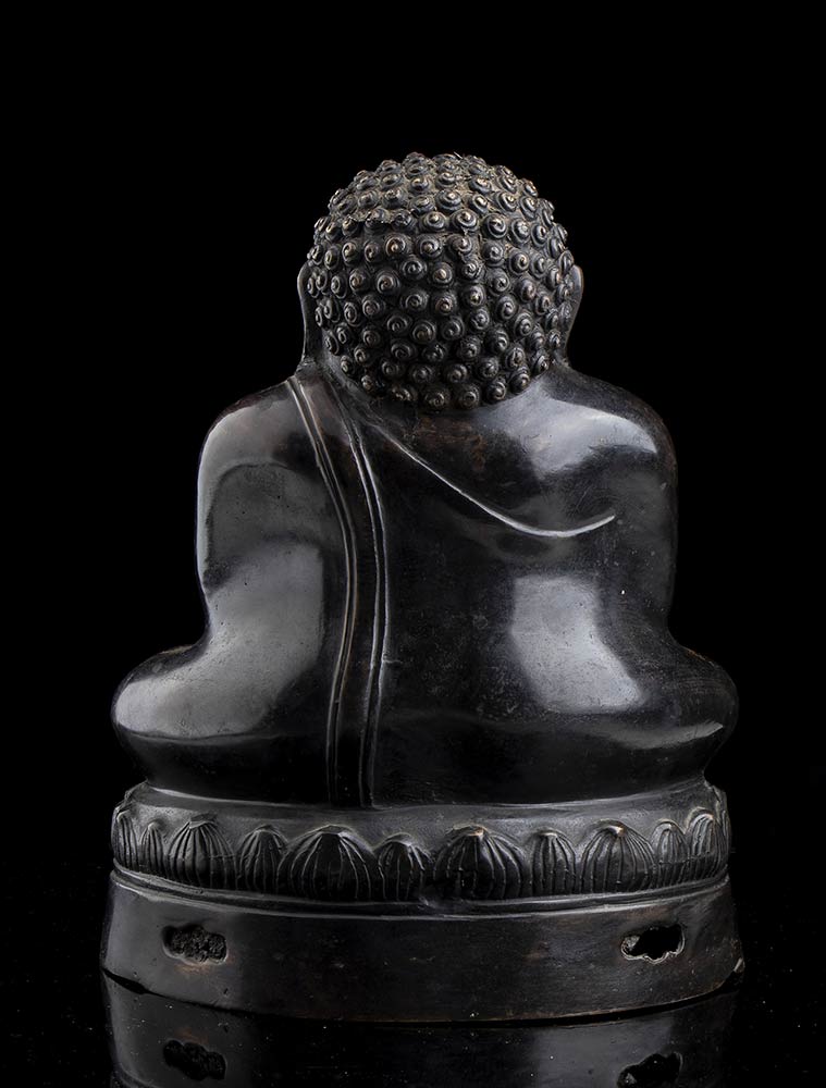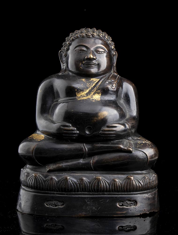 La divinità seduta in posizione dyhanasana su base a fiore di loto, le mani posate sul grembo prominente.