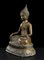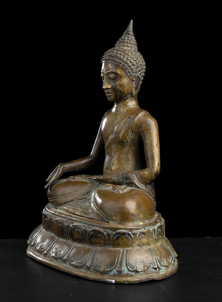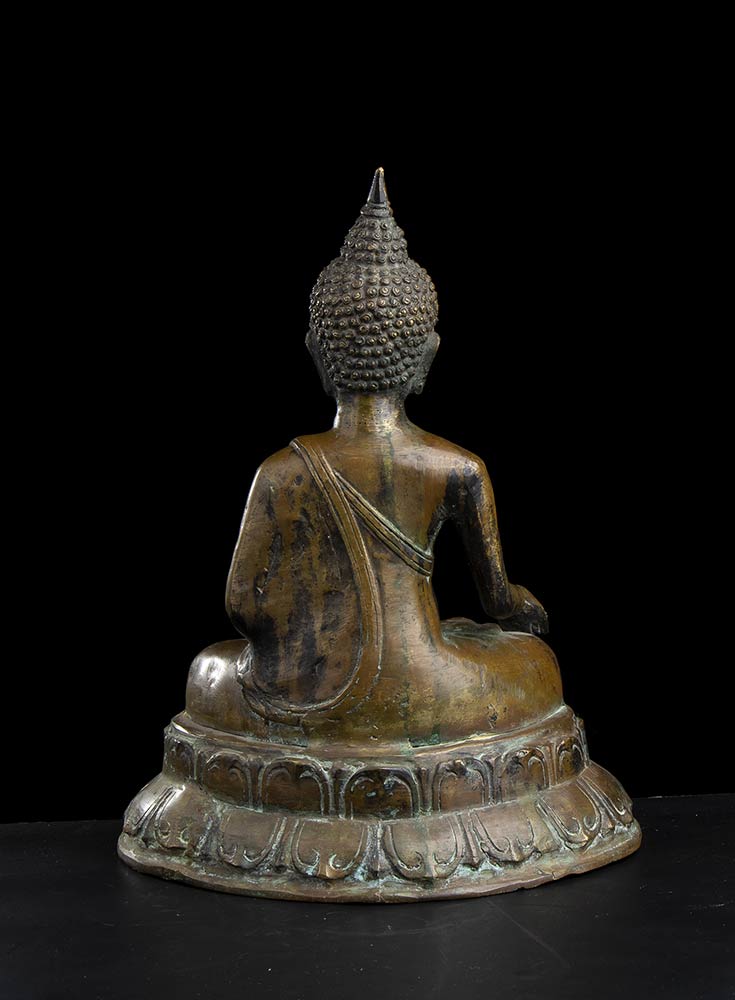 La divinità seduta in posizione dhyanasana su base a doppio fiore di loto, la mano destra in abhayamudra, quella sinistra posata sul grembo, la testa sormontata da alto usnisa conico.