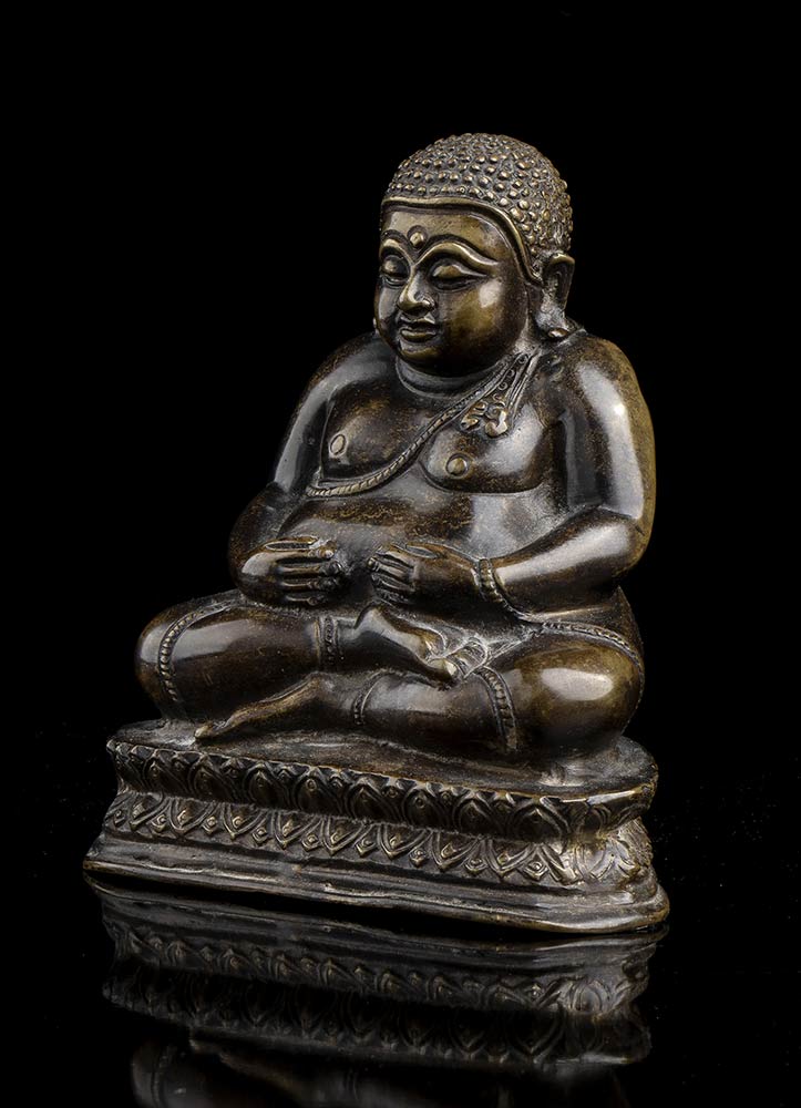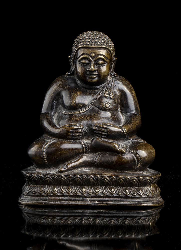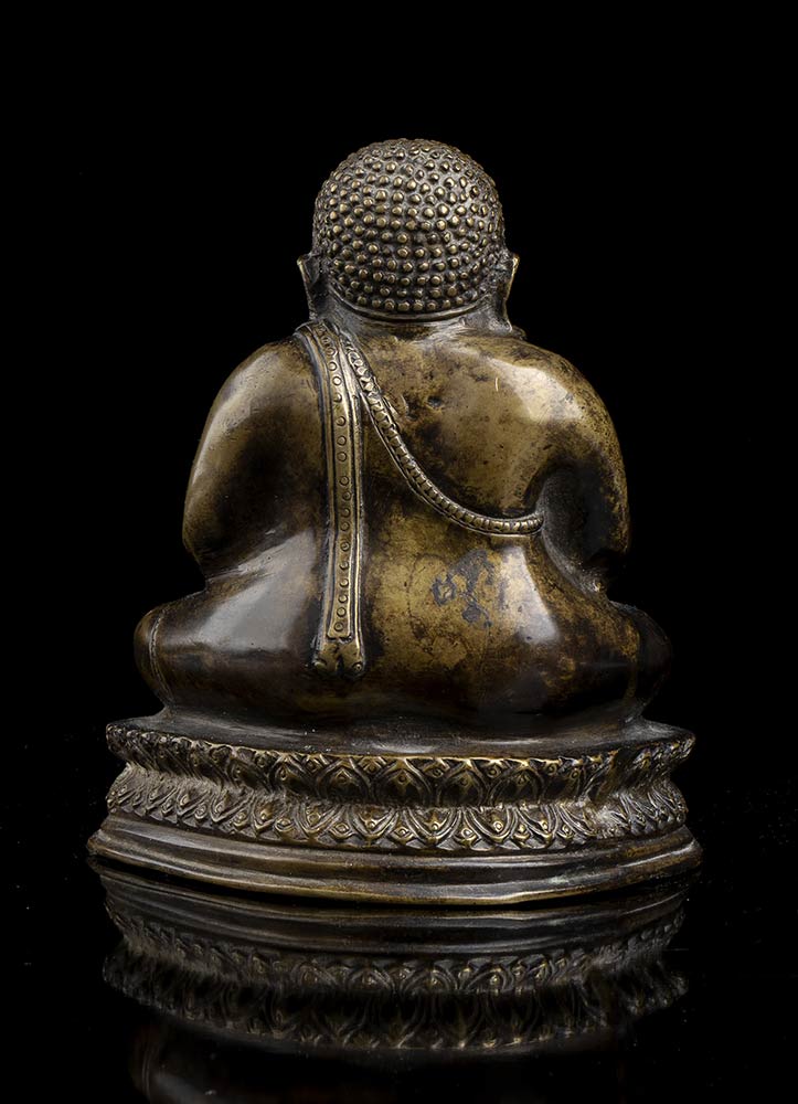 La divinità seduta in posizione dyhanasana su base a fiore di loto, le mani posate sul grembo prominente.