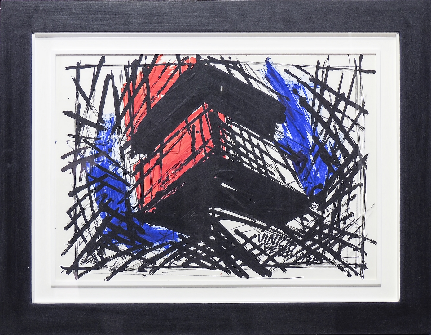 VINICIO BERTI (1921-1991) Grande costruzione positiva acrilico su cartone, firmato e datato 1986, in cornice cm 50x70 Autentica della Galleria d'Arte Bigi Firenze su fotografia
