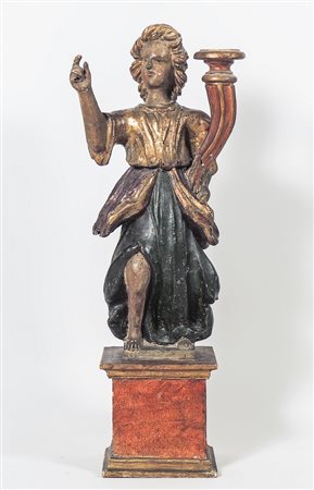 ANGELO PORTACERO IN LEGNO INTAGLIATO E DORATO XVII secolo alcuni restauri, h cm 65