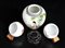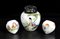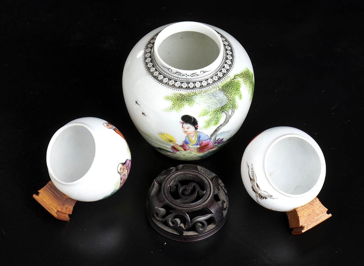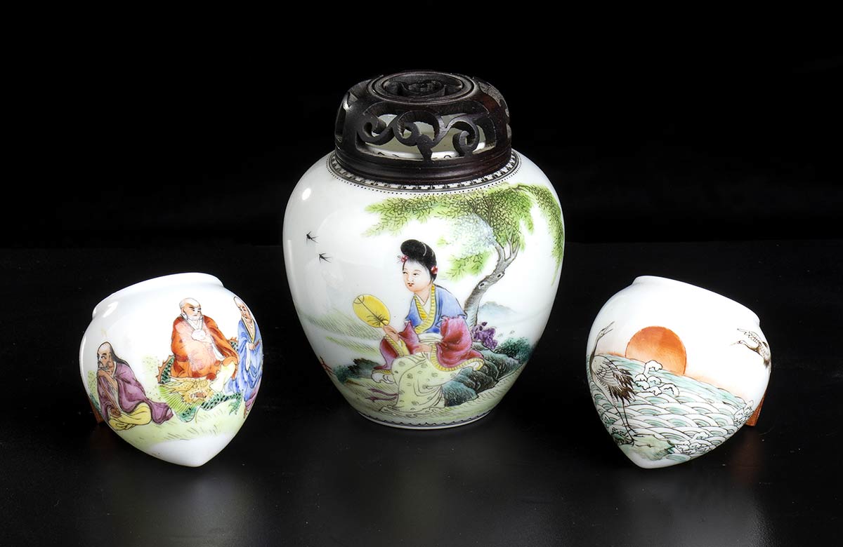 UN PICCOLO VASO E DUE MANGIATOIE PER UCCELLI IN PORCELLANA CON DECORO A SMALTI POLICROMI