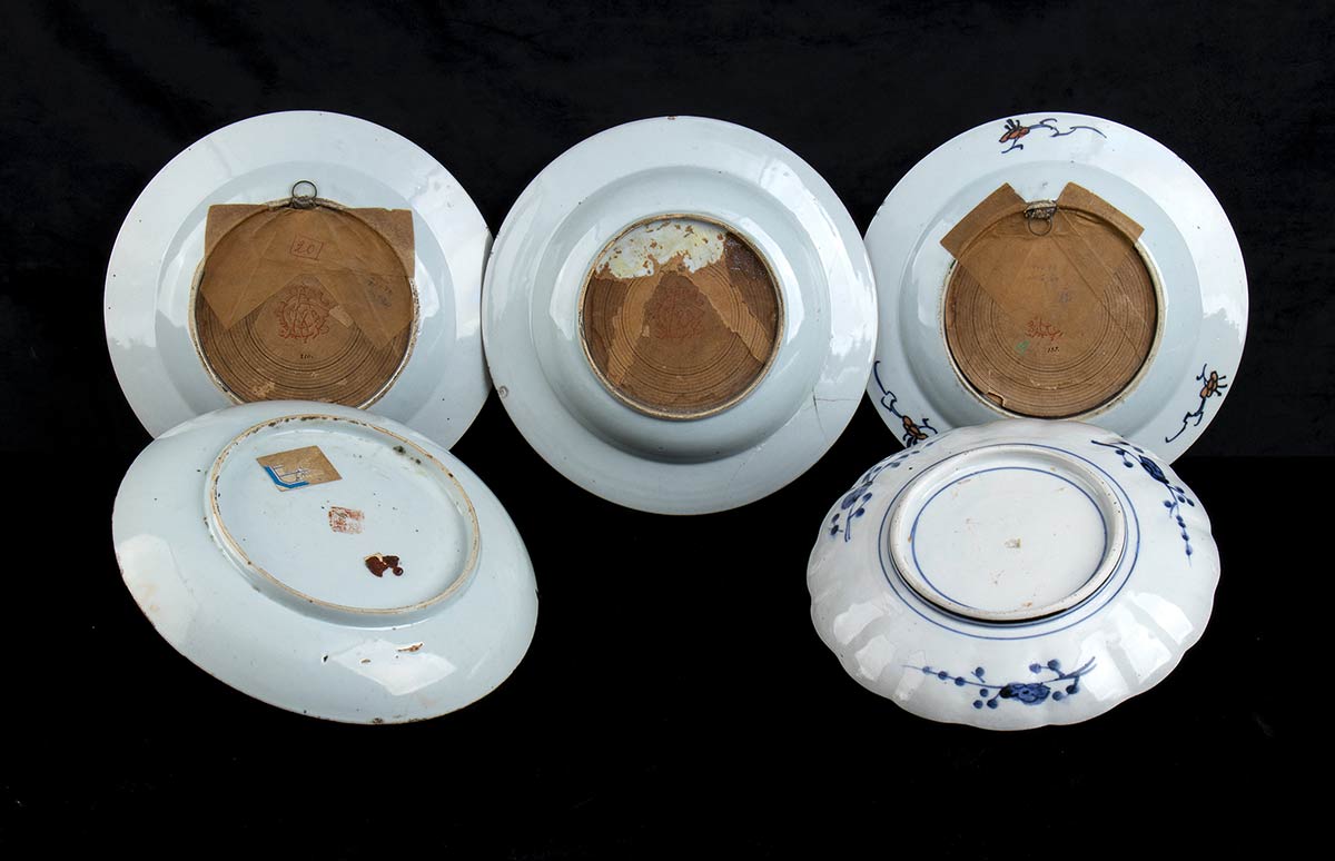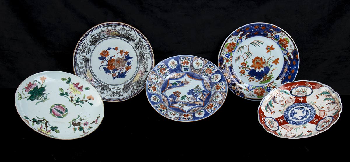 CINQUE PIATTI IN PORCELLANA CON DECORO A SMALTI POLICROMI
