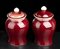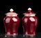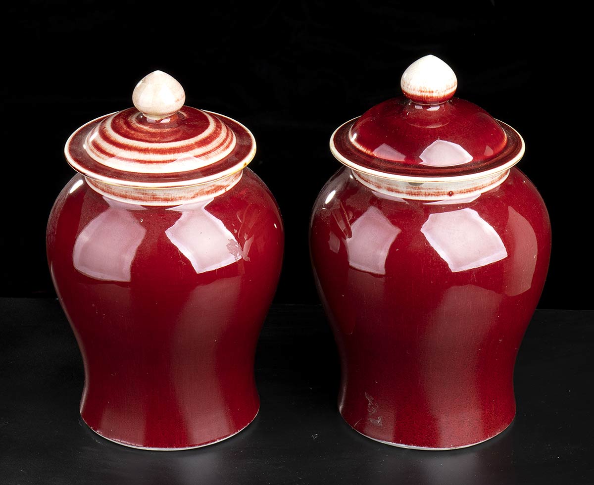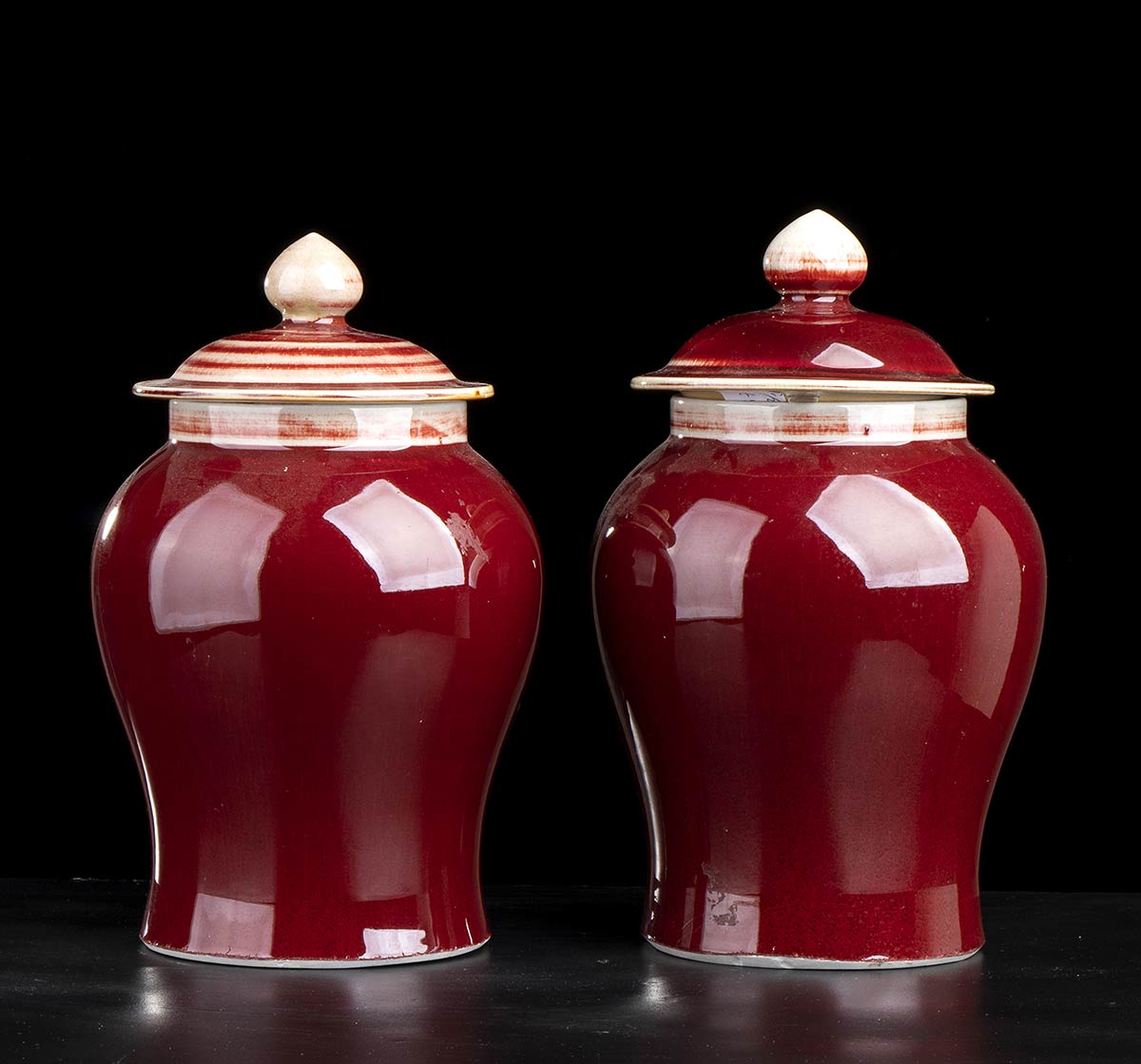 COPPIA DI POTICHES CON COPERCHIO IN PORCELLANA CON INVETRIATURA ‘SANGUE DI BUE’