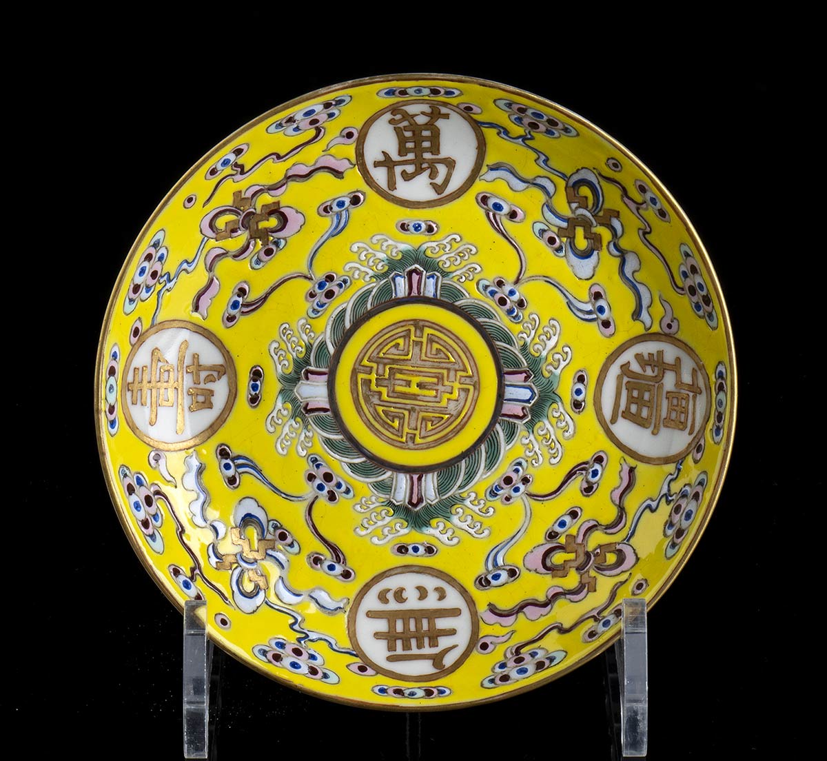 Al centro della superficie a vista il carattere shou (“longevità”), intorno quattro medaglioni circolari con i caratteri 萬壽無疆 (wan shou wu jiang, “possa tu vivere per migliaia di anni”) raccordati da nuvole stilizzate, sul retro della parete tre tralci fioriti.