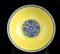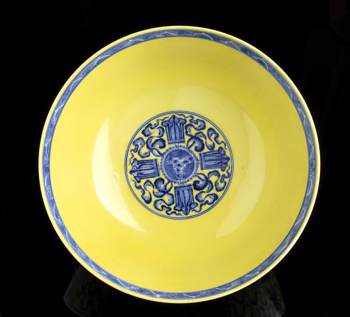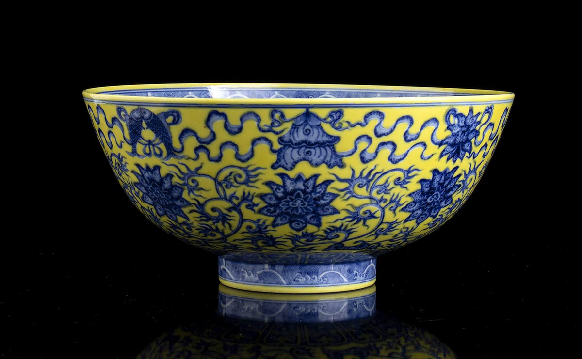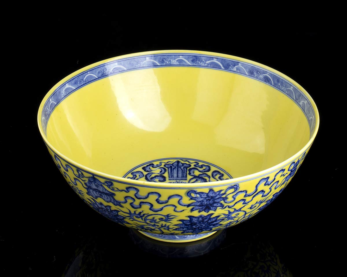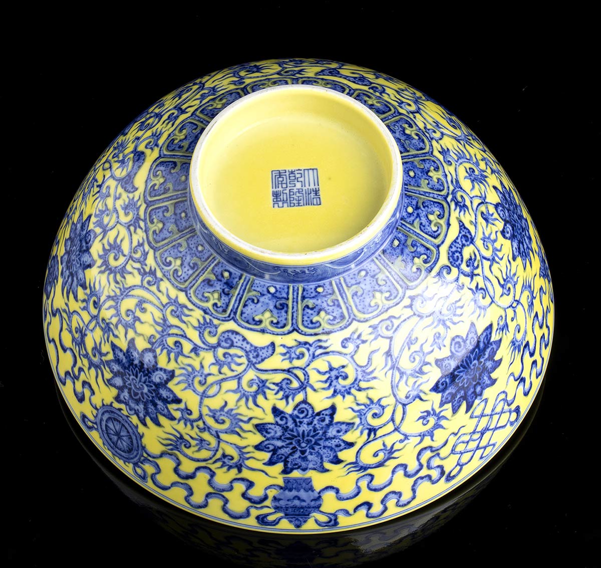 L’esterno decorato in blu di cobalto sotto coperta su fondo giallo con arabeschi di fiori di loto e simboli beneaugurali, marchio apocrifo di Qianlong al centro della base.