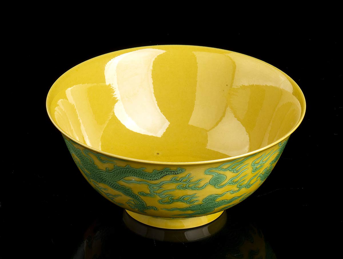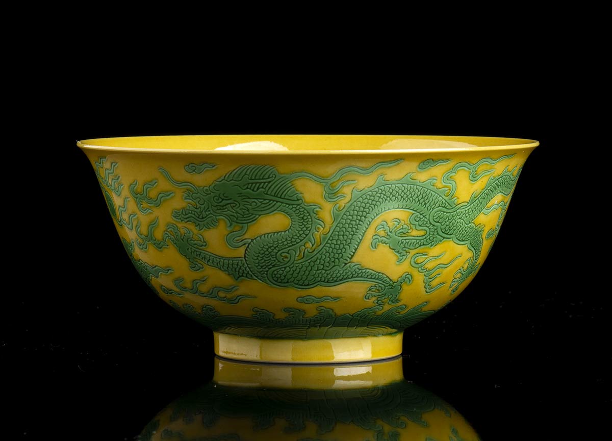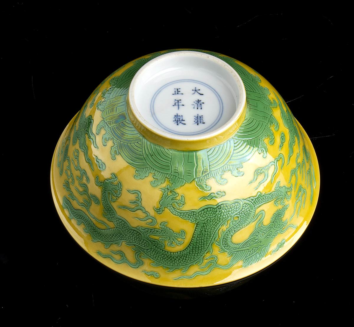 L’esterno con draghi in volo tra nuvole e dardi fiammeggianti, dettagli incisi, marchio apocrifo di Yongzheng al centro della base.