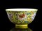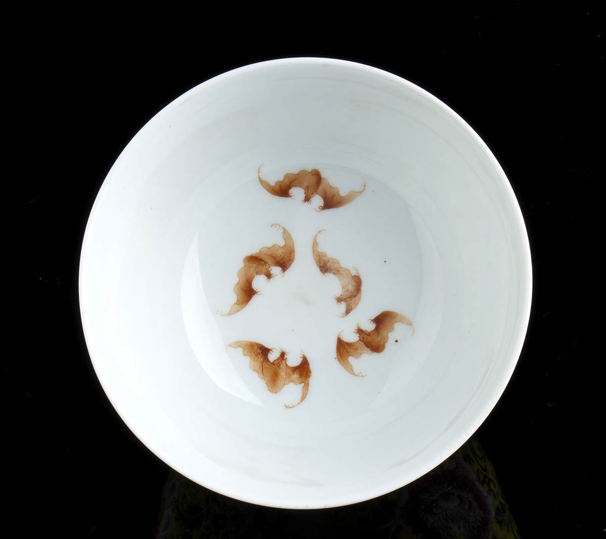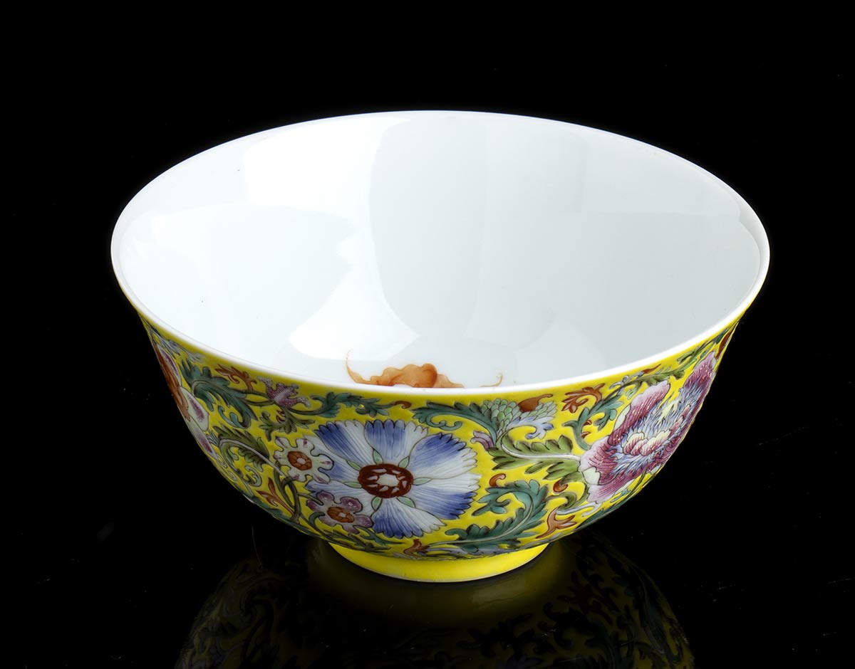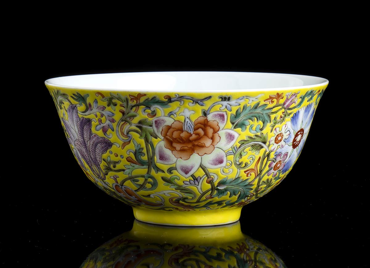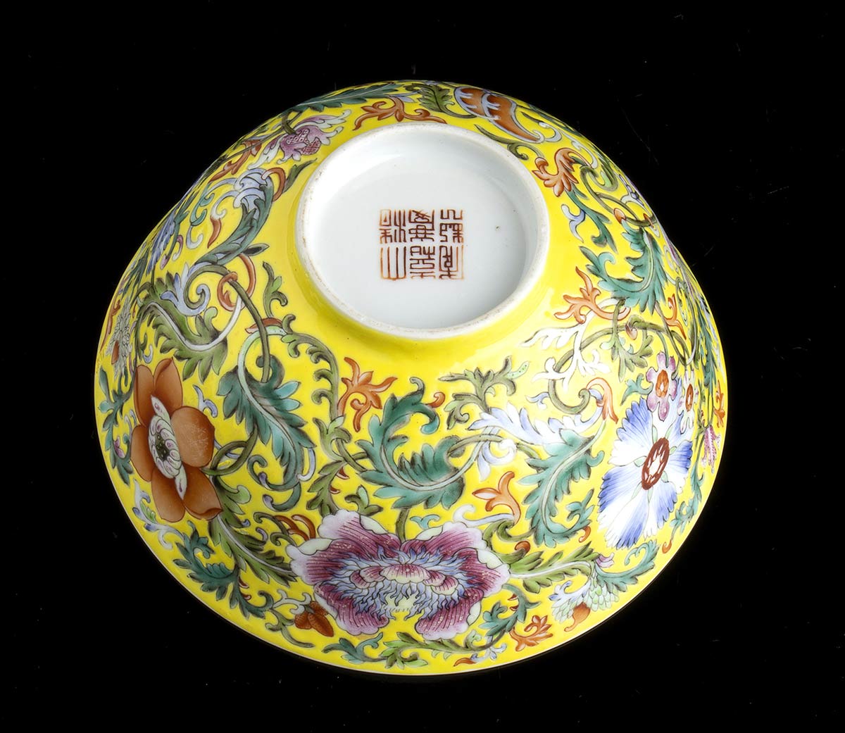 L’esterno decorato con fiori policromi su fondo giallo, l’interno con cinque pipistrelli, marchio apocrifo di Jiaqing al centro della base.