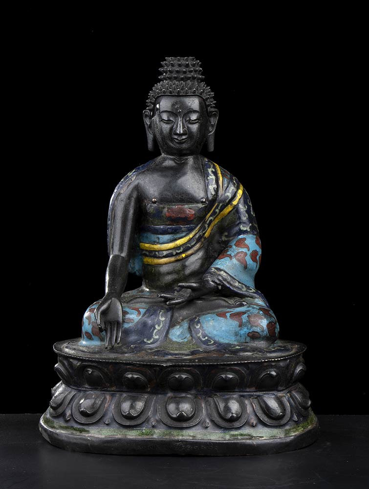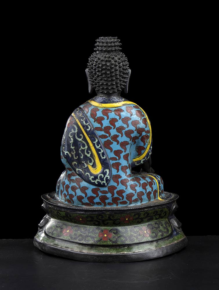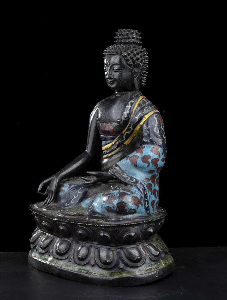 La divinità seduta su base a doppio fiore di loto con le gambe incrociate in posizione dhyanasana, la mano destra nel gesto di toccare la terra (abhayamudra), l’ampio abito decorato a smalti policromi applicati a cloisonné.