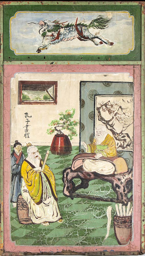 In alto un riquadro con un animale mitologico, in basso una scena ambientata all’interno di una casa raffigurante l’incontro tra due anziani filosofi, uno accompagnato dal suo giovane paggio.