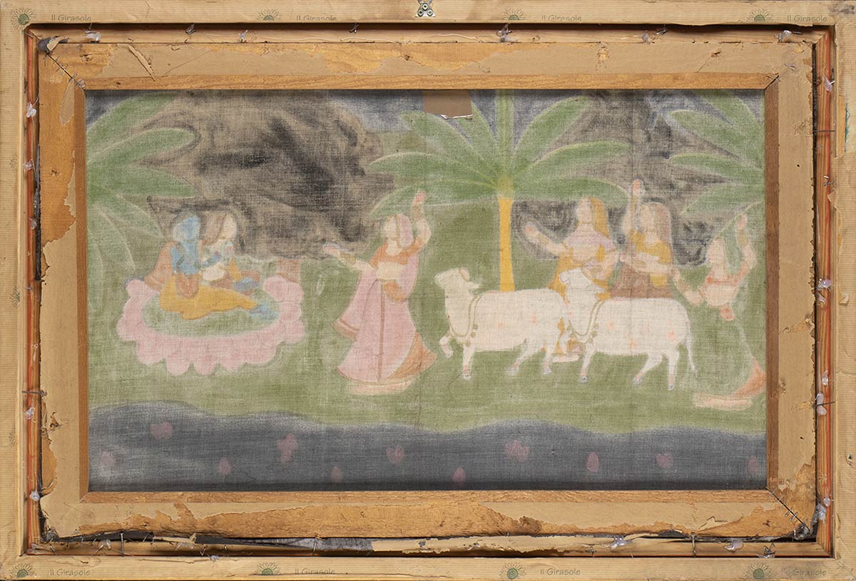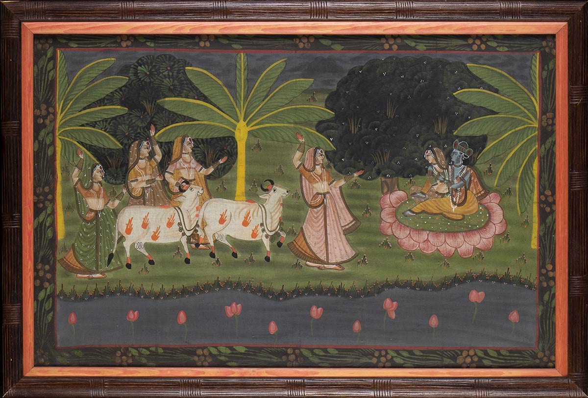 DIPINTO ‘PICHHWAI’ A COLORI SU TESSUTO CON KRISHNA, FIGURE FEMMINILI E VACCHE NEL PAESAGGIO
