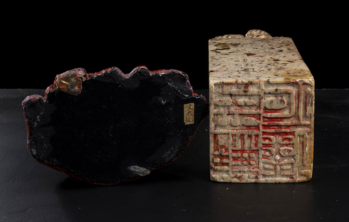 TRE SIGILLI IN PIETRA E UN BUDAI A LACCA ROSSA