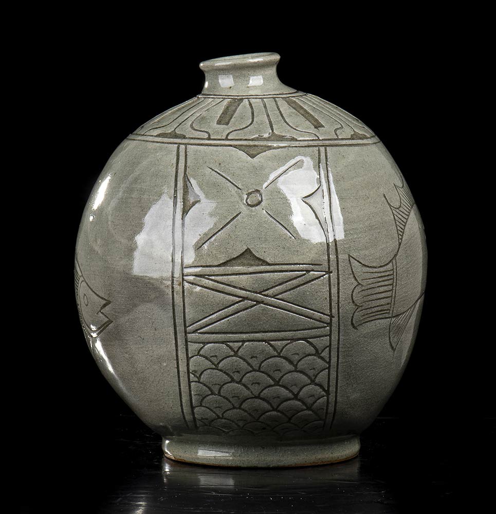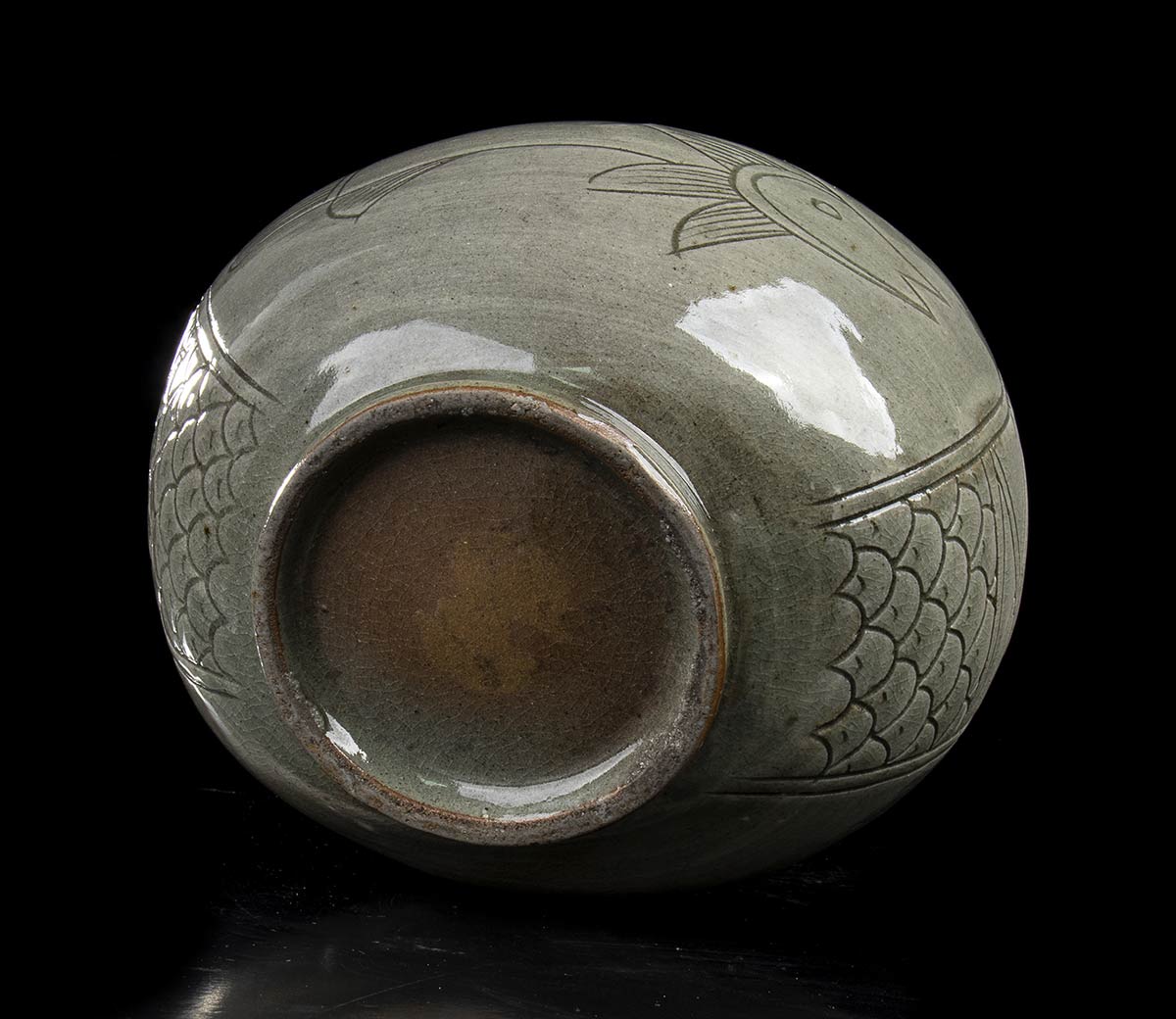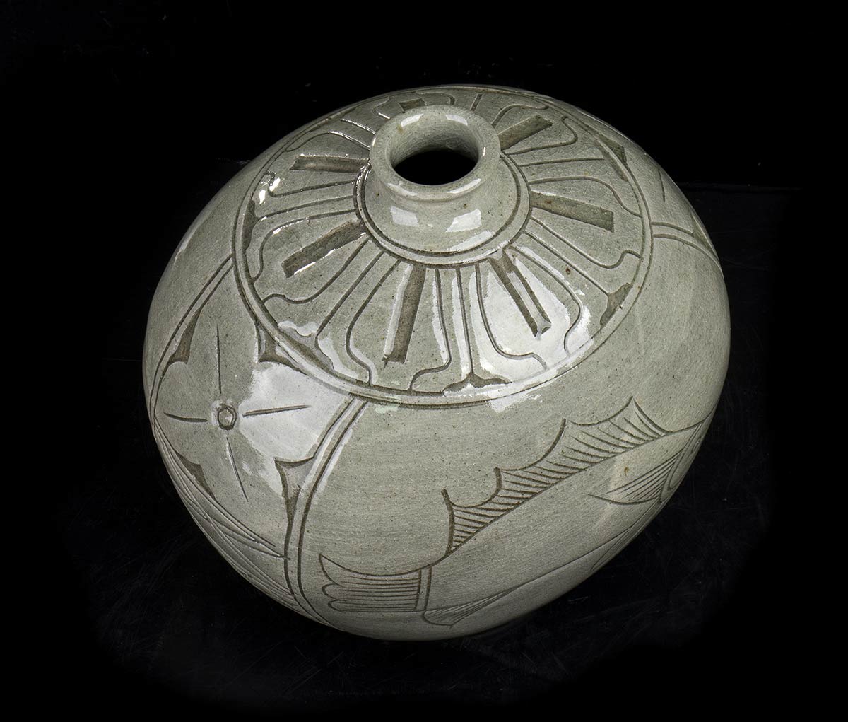 VASO GLOBULARE IN CERAMICA CON INVETRIATURA CÉLADON E DECORO INCISO