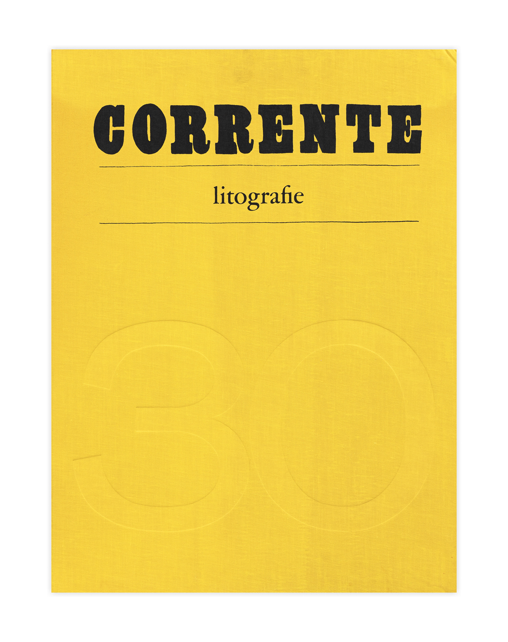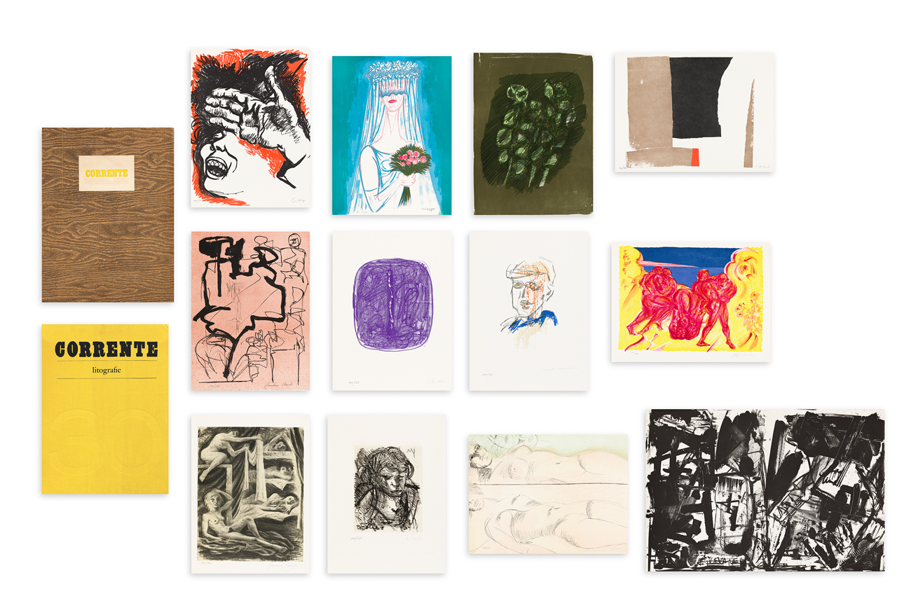 Cartella celebrativa dei 30 anni della rivista 'Corrente' composta da un testo autografo di Raffaele De Grada riprodotto in litografia e litografie originali a colori dei seguenti artisti: Arnaldo Badodi (Oggi è una giornata grigia), Renato Birolli (Figura), Bruno Cassinari (Figure), Sandro Cherchi (Figure), Lucio Fontana (Concetto Spaziale), Renato Guttuso (Pensando al futuro), Giuseppe Migneco (La sposa), Ennio Morlotti (Corrente controcorrente), Aligi Sassu (La terre est bleu comme une orange), Ernesto Treccani (Autoritratto), Italo Valenti (Oleggio), Emilio Vedova (Scontro di situazioni), ciascuna contenuta in quartino riproducente in litografia testi autografi e disegni degli Artisti