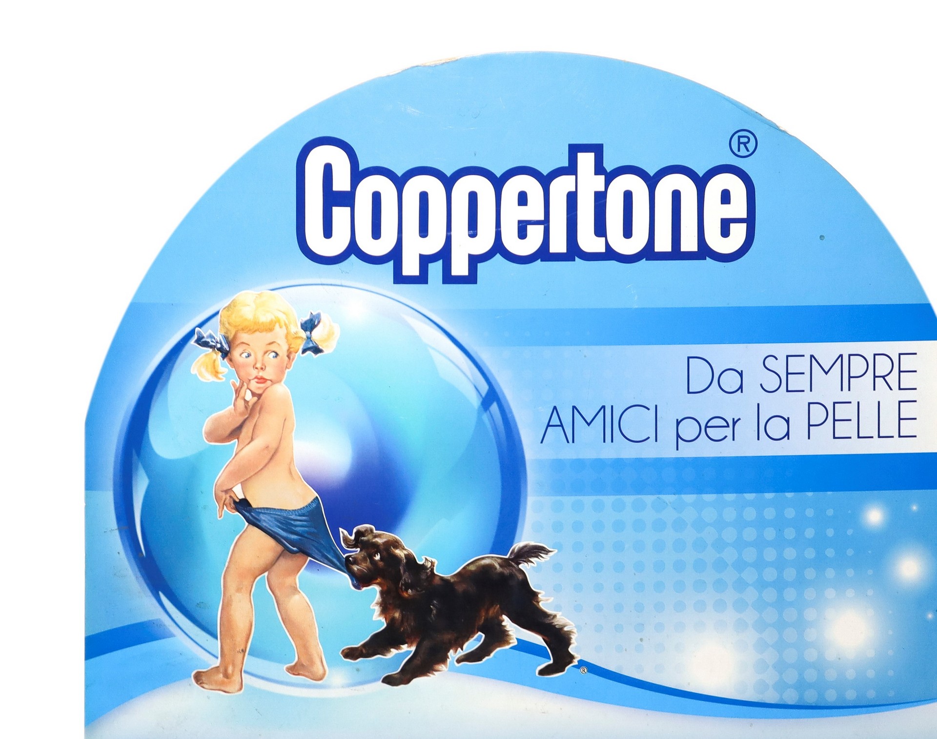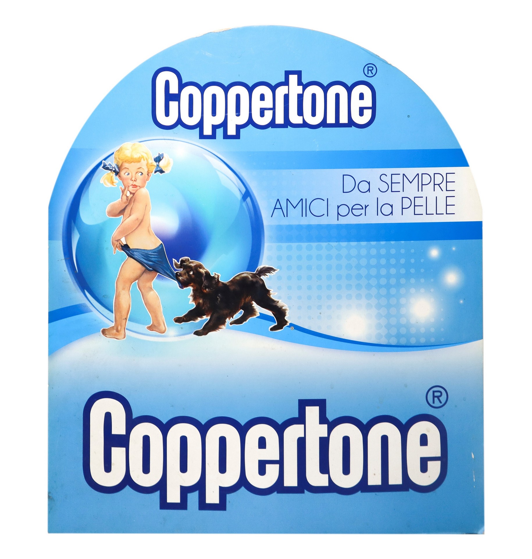 Copper Tone - Cartonato promozionale abbronzante, 1980 h cm 55x47 Cartone plastificato di colore azzurro.
